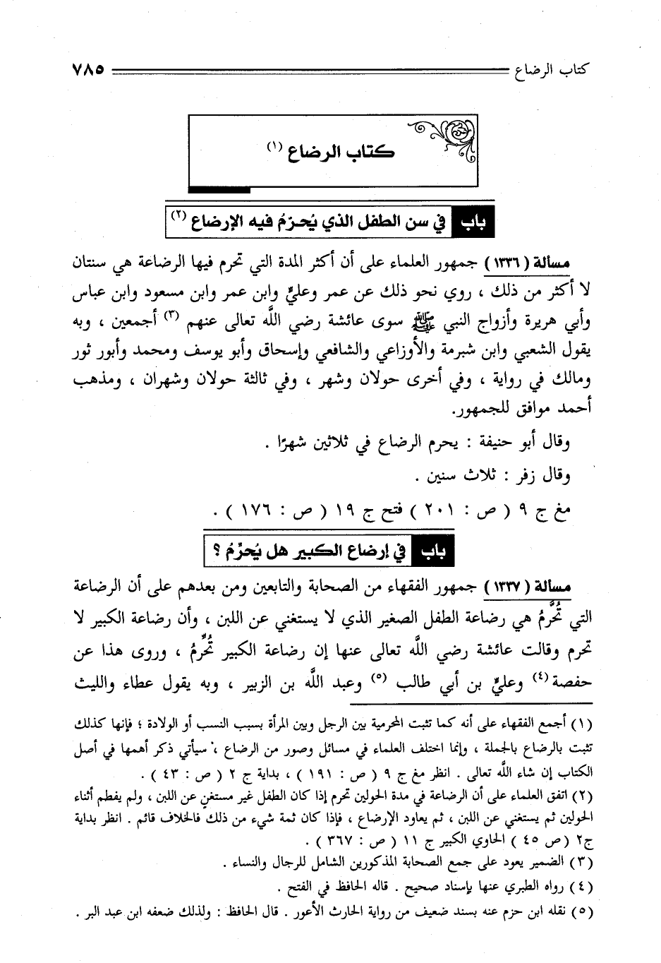 مسألة (1337) جمهور الفقهاء من الصحابة والتابعين ومن بعدهم على أن الرضاعة التي تُحَّرمُ هي رضاعة الطفل الصغير الذي لا يستغني عن اللبن، وأن رضاعة الكبير لا تحرم وقالت عائشة رضي اللَّه تعالى عنها إن رضاعة الكبير تُحِّرمُ، وروى هذا عن حفصة (¬4) وعليٍّ بن أبي طالب (¬5) وعبد اللَّه بن الزبير، وبه يقول عطاء والليث