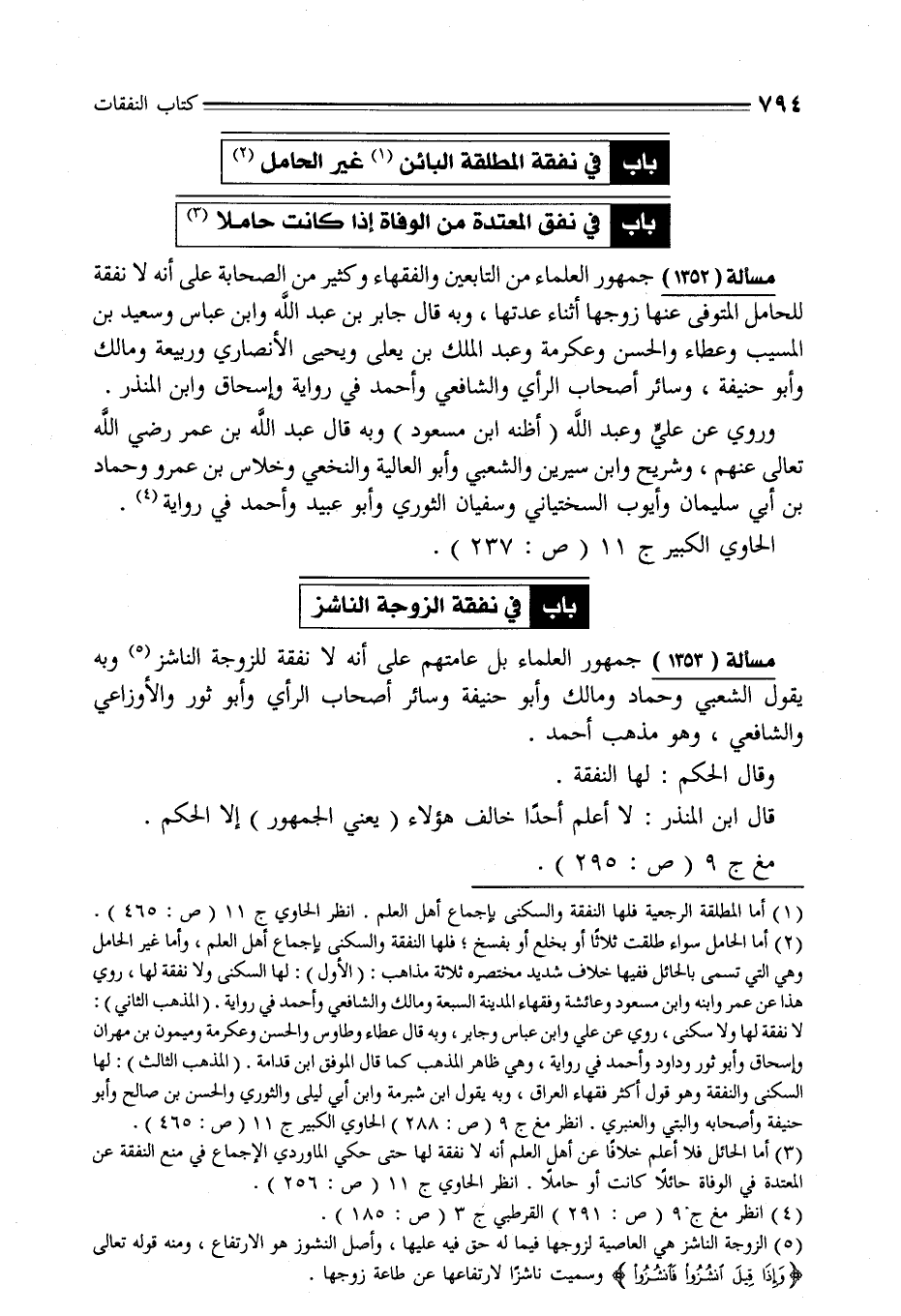 مسألة (1352) جمهور العلماء من التابعين والفقهاء وكثير من الصحابة على أنه لا نفقة للحامل المتوفى عنها زوجها أثناء عدتها، وبه قال جابر بن عبد اللَّه وابن عباس وسعيد بن المسيب وعطاء والحسن وعكرمة وعبد الملك بن يعلى ويحيى الأنصاري وربيعة ومالك وأبو حنيفة، وسائر أصحاب الرأي والشافعي وأحمد في رواية وإسحاق وابن المنذر.