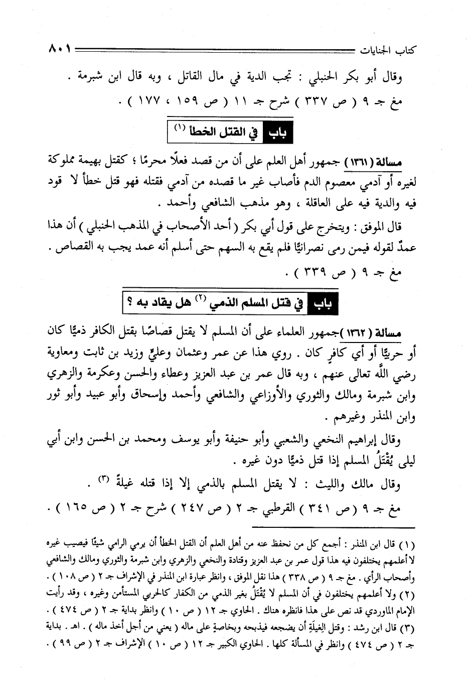 (¬2) ولا أعلمهم يختلفون في أن المسلم لا يُقْتَلُ بغير الذمي من الكفار كالحربي المستأمن وغيره، وقد رأيت الإِمام الماوردي قد نص على هذا فانظره هناك. الحاوي جـ 12 (ص 10) وانظر بداية جـ 2 (ص 474).