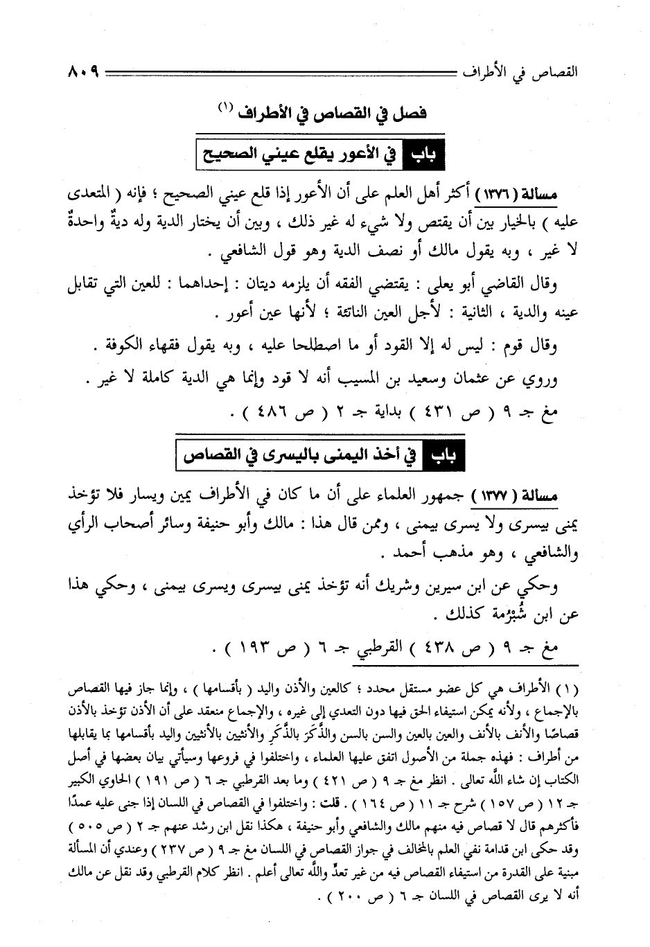 (¬1) الأطراف هي كل عضو مستقل محدد؛ كالعين والأذن واليد (بأقسامها)، وإنما جاز فيها القصاص بالإجماع، ولأنه يمكن استيفاء الحق فيها دون التعدي إلى غيره، والإجماع منعقد على أن الأذن تؤخذ بالأذن قصاصًا والأنف بالأنف والعين بالعين والسن بالسن والذَّكَرَ بالذَّكَرِ والأنثيين بالأنثيين واليد بأقسامها بما يقابلها من أطراف: فهذه جملة من الأصول اتفق عليها العلماء، واختلفوا في فروعها وسيأتي بيان بعضها في أصل الكتاب إن شاء اللَّه تعالى. انظر مغ جـ 9 (ص 421) وما بعد القرطبي جـ 6 (ص 191) الحاوي الكبير جـ 12 (ص 157) شرح جـ 11 (ص 164). قلت: واختلفوا في القصاص في اللسان إذا جنى عليه عمدًا فأكثرهم قال لا قصاص فيه منهم مالك والشافعي وأبو حنيفة، هكذا نقل ابن رشد عنهم جـ 2 (ص 505) وقد حكى ابن قدامة نفي العلم بالمخالف في جواز القصاص في اللسان مغ جـ 9 (ص 237) وعندي أن المسألة مبنية على القدرة من استيفاء القصاص فيه من غير تعدِّ واللَّه تعالى أعلم. انظر كلام القرطبي وقد نقل عن مالك أنه لا يرى القصاص في اللسان جـ 6 (ص 200).