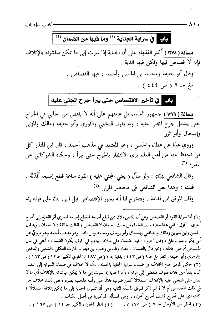 (¬1) أما سراية القود أو القصاص وهي أن يقتص فلان ممن قطع أصبعه فيقطع إصبعه فيسري أثر القطع إلى أصبع أخرى. أقول: ففي هذا خلاف بين العلماء من حيث الضمان لا القصاص؛ فقالت طائفة: لا ضمان، وبه قال الحسن وابن سيرين ومالك والشافعي وإسحاق وأبو يوسف ومحمد وابن المنذر وهو مذهب أحمد وهو مرويُّ عن أبي بكر وعمر وعليٍّ، وقال آخرون: فيه الضمان على خلاف بينهم في كيف يكون الضمان، أعني في مال المستوفى أم على عاقلته، وممن قال بالضمان: عطاء وطاوس وعمرو بن دينار والحارث العكلي والشعبي والنخعي والزهري وأبو حنيفة. انظر مغ جـ 9 (ص 443) بداية جـ 2 (ص 487) الحاوي الكبير جـ 12 (ص 163).