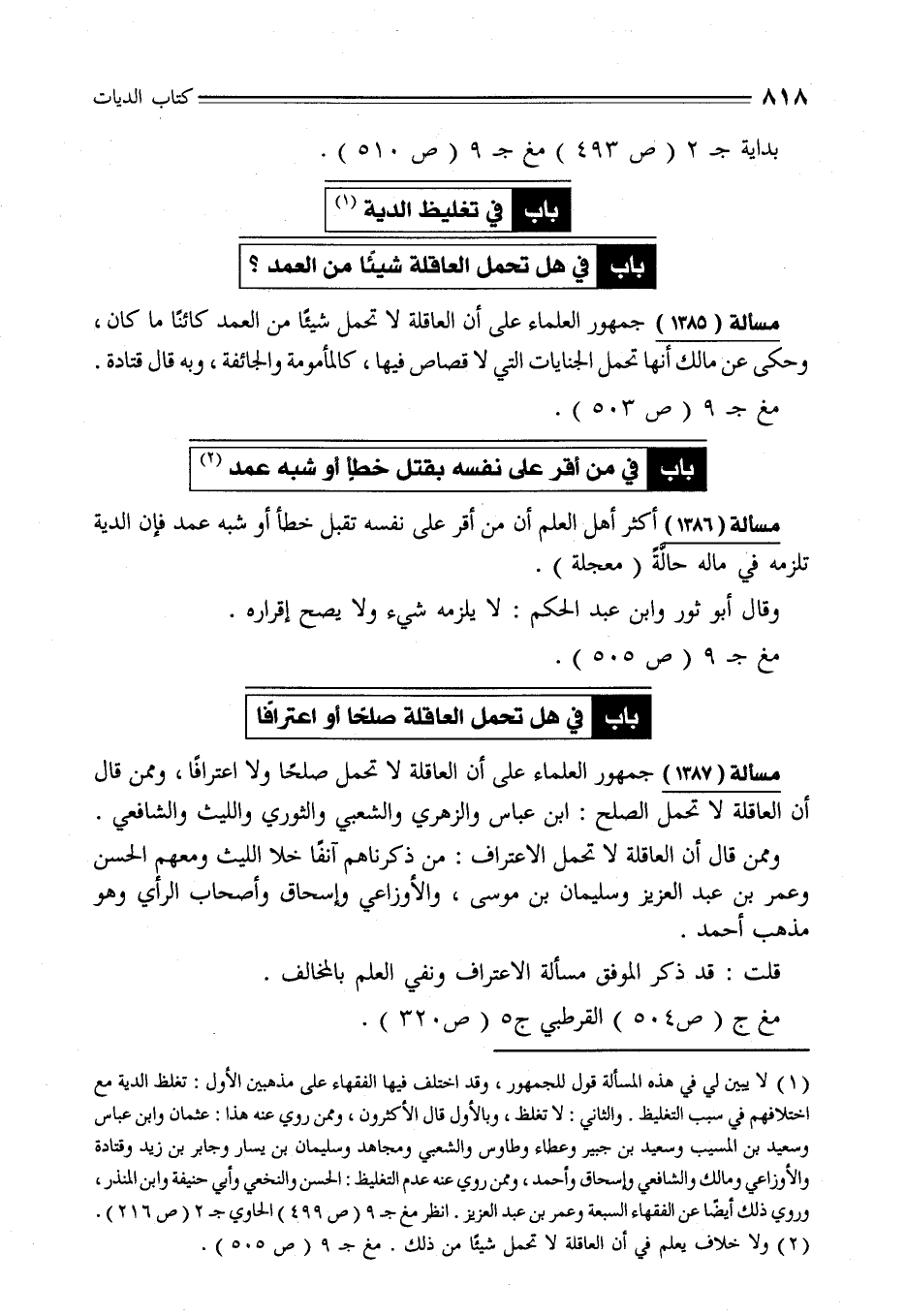 مسألة (1387) جمهور العلماء على أن العاقلة لا تحمل صلحًا ولا اعترافًا، وممن قال أن العاقلة لا تحمل الصلح: ابن عباس والزهري والشعبي والثوري والليث والشافعي.
