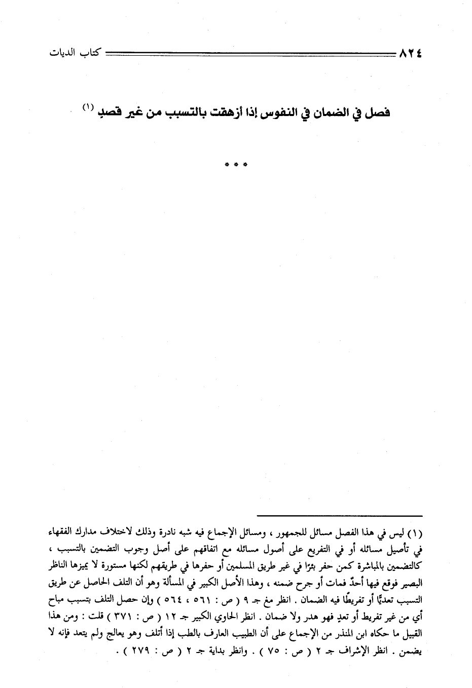 (¬1) ليس في هذا الفصل مسائل للجمهور، ومسائل الإجماع فيه شبه نادرة وذلك لاختلاف مدارك الفقهاء في تأصيل مسائله أو في التفريع على أصول مسائله مع اتفاقهم على أصل وجوب التضمين بالتسبب، كالتضمين بالمباشرة كمن حفر بئرًا في غير طريق المسلمين أو حفرها في طريقهم لكنها مستورة لا يميزها الناظر البصير فوقع فيها أحدٌ فمات أو جرح ضمنه، وهذا الأصل الكبير في المسأله وهو أن التلف الحاصل عن طريق التسبب تعديًّا أو تفريطًا فيه الضمان. انظر مغ جـ 9 (ص: 561، 564) وإن حصل التلف بتسبب مباح أي من غير تفريط أو تعدٍ فهو هدر ولا ضمان. انظر الحاوي الكبير جـ 12 (ص: 371) قلت: ومن هذا القبيل ما حكاه ابن المنذر من الإجماع على أن الطبيب العارف بالطب إذا أتلف وهو يعالج ولم يتعد فإنه لا يضمن. انظر الإشراف جـ 2 (ص: 75). وانظر بداية جـ 2 (ص: 279).