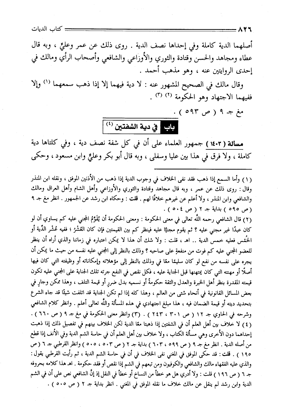 (¬4) لا خلاف بين أهل العلم أن في الشفتين إذا ذهبتا معًا الدية لكن الخلاف بينهم في تفصيل ذلك إذا ذهبت إحداهما دون الأخرى وهي مسألة الكتاب، ولا خلاف بين أهل العلم أن في حاسة الشم الدية وفي الأنف إذا قطع من أصله الدية. انظر مغ جـ 9 (ص 599، 603) بداية جـ 2 (ص 503، 505) وانظر القرطبي جـ 6 (ص 195). قلت: قد حكى الموفق في المغنىِ نفى الخلف في أن في حاسة الشم الدية، ثم رأيت القرطبي يقول: والذي عليه الفقهاء مالك والشافعي والكوفيون ومن تبعهم في الشم إذا نقص أو فقد حكومة. اهـ هذا كلامه بحروفه جـ 6 (ص 196) قلت: ولا أدري هل هو خطأ من النساخ أو خطاً في النقل إذ إنَّ الشافعي نص على أن في الشم الدية وابن رشد لم ينقل عن مالك خلاف ما نقله الموفق في المغني. انظر بداية جـ 2 (ص 505).