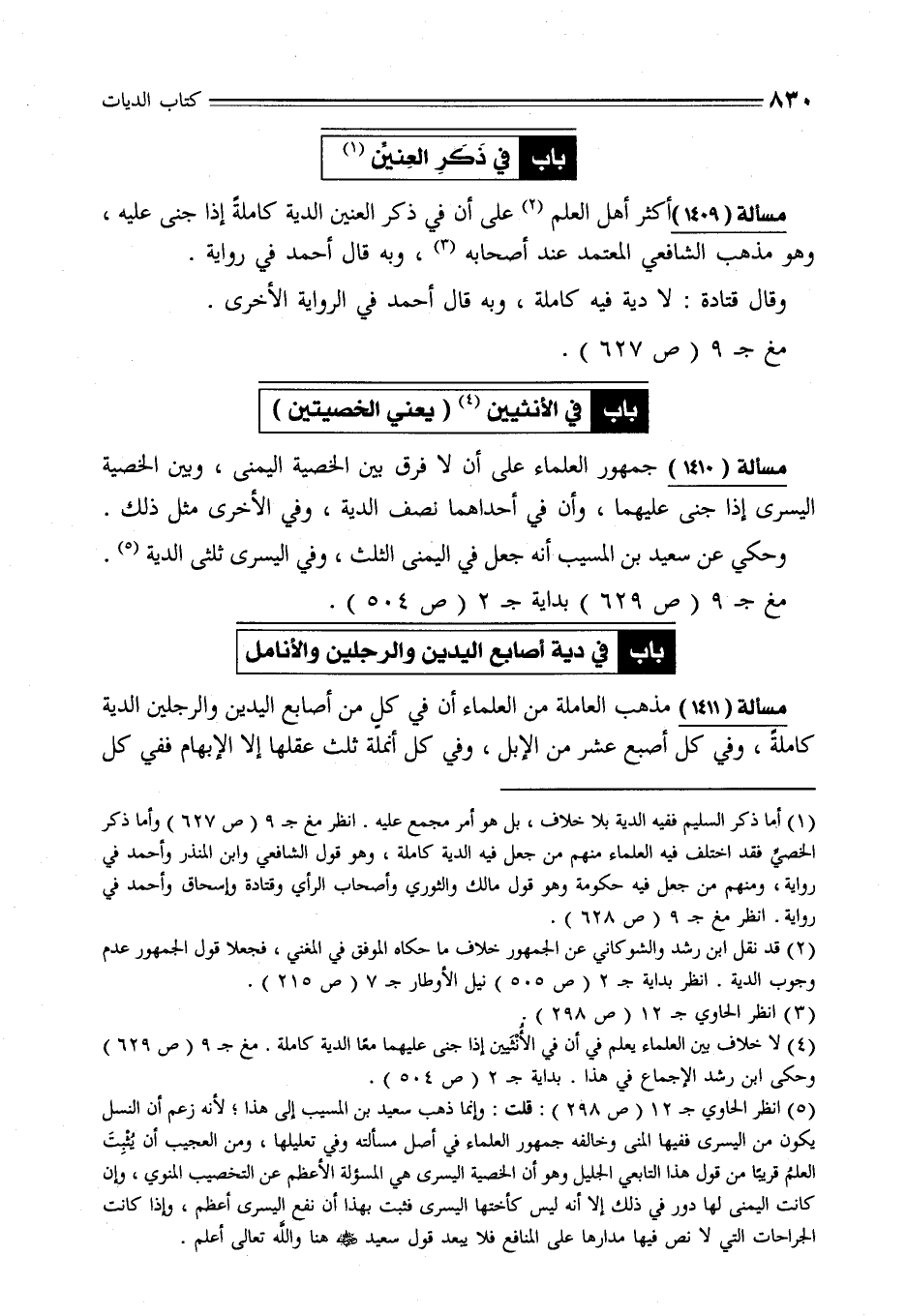 (¬4) لا خلاف بين العلماء يعلم في أن في الأُنْثَيين إذا جنى عليهما معًا الدية كاملة. مغ جـ 9 (ص 629) وحكى ابن رشد الإجماع في هذا. بداية جـ 2 (ص 504).
