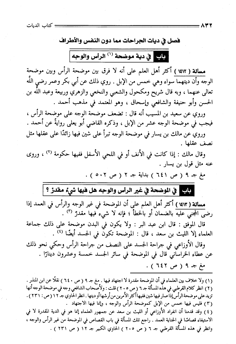 (¬2) انظر كلام القرطبي في هذه المسألة جـ 6 (ص 205) قلت: ولأصحاب الشافعي وجه في موضحة الوجه أنها تزيد على موضحة الرأس أذا صار فيها شين ففيها أكثر الأمرين من أرشها أو ديتها. انظر الحاوي جـ 12 (ص: 231).