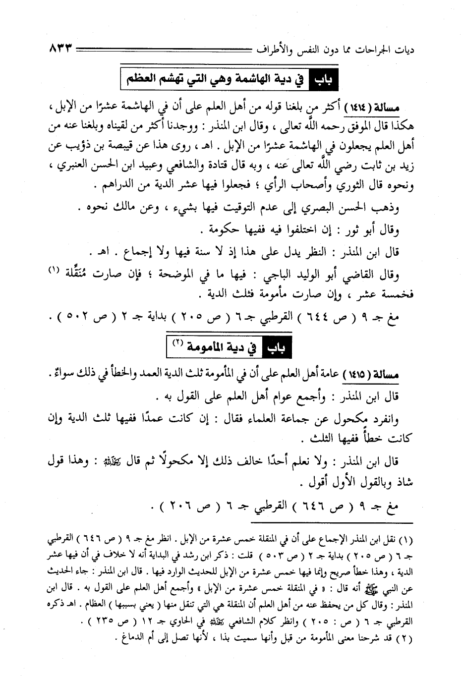 (¬1) نقل ابن المنذر الإجماع على أن في المنقلة خمس عشرة من الإبل. انظر مغ جـ 9 (ص 646) القرطبي جـ 6 (ص 205) بداية جـ 2 (ص 503) قلت: ذكر ابن رشد في البداية أنه لا خلاف في أن فيها عشر الدية، وهذا خطأ صريح وإنما فيها خمس عشرة من الإبل للحديث الوارد فيها. قال ابن المنذر: جاء الحديث عن النبي - صلى الله عليه وسلم - أنه قال: "في المنقلة خمس عشرة من الإبل" وأجمع أهل العلم على القول به. قال ابن المنذر: وقال كل من يحفظ عنه من أهل العلم أن المنقلة هي التي تنقل منها (يعني بسببها) العظام. اهـ ذكره القرطبي جـ 6 (ص: 205) وانظر كلام الشافعي -رحمه الله- في الحاوي جـ 12 (ص 235).