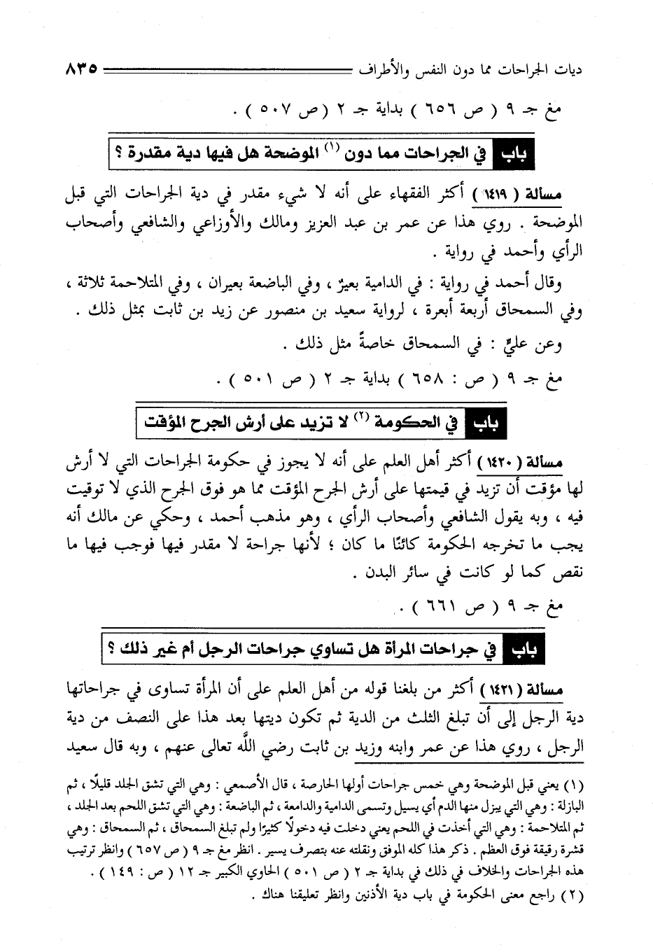 مسألة (1419) أكثر الفقهاء على أنه لا شيء مقدر في دية الجراحات التي قبل الموضحة. روي هذا عن عمر بن عبد العزيز ومالك والأوزاعي والشافعي وأصحاب الرأي وأحمد في رواية.