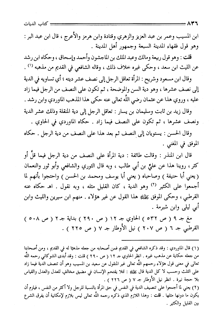 قال ابن المنذر: وقالت طائفة: دية المرأة على النصف من دية الرجل فيما قلَّ أو كثر، روينا هذا عن عليٍّ بن أبي طالب، وبه قال الثوري والشافعي وأبو ثور والنعمان (يعني أبا حنيفة) وصاحباه (يعني أبا يوسف ومحمد بن الحسن) واحتجوا بأنهم لما أجمعوا على الكثير (¬2) وهو الدية، كان القليل مثله، وبه نقول. اهـ حكاه عنه القرطبي، وحكى الموفق -رحمه الله- هذا القول عن غير هؤلاء. منهم ابن سيرين والليث وابن أبي ليلى وابن شبرمة.
