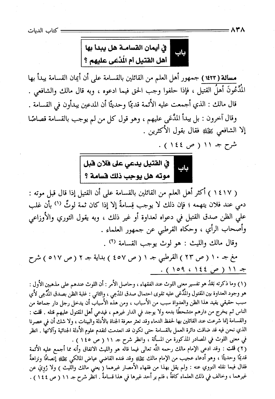 (¬1) وما ذكرته بَعْدُ هو تفسير معنى اللوث عند الفقهاء، وحاصل الأمر: أن اللوث عندهم على مذهبن الأول: هو وجود العداوة بين المقتول والمُدَّعَى عليه تقوى احتمال صدق المدّعِي، والثاني: غلبة الظن بصدق المُدَّعِى لأي سبب حقيقي يفيد هذا الظن والعدواة سبب من الأسباب، ومن هذه الأسباب أن يدخل رجل دار جماعة من الناس ثم يخرج من دارهم متشحطًا بدمه ولا يوجد في الدار غيرهم، فيدعي أهل المقتول عليهم قتله. قلت: والقسامة إنما شرعت عند القائلين بها لحفظ الدماء وقد تعثر معرفة الجناة بالإدلة والبينات، ولا شك أن في عصرنا الذي نحن فيه قد ضاقت دائرة العمل بالقسامة حتى تكون قد انعدمت لتقدم علوم الأدلة الجنائية وآلاتها. انظر في معنى اللوث في المصادر المذكورة من المسألة، وانظر شرح جـ 11 (ص 145).