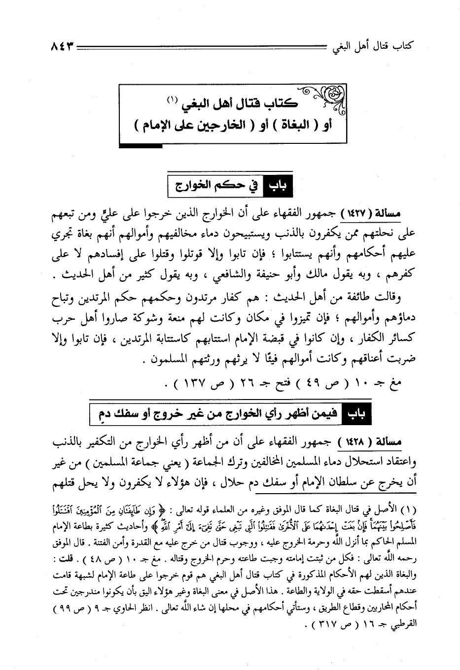 مسألة (1437) جمهور الفقهاء على أن الخوارج الذين خرجوا على عليِّ ومن تبعهم على نحلتهم ممن يكفرون بالذنب ويستبيحون دماء مخالفيهم وأموالهم أنهم بغاة تجري عليهم أحكامهم وأنهم يستتابوا؛ فإن تابوا وإلا قوتلوا وقتلوا على إفسادهم لا على كفرهم، وبه يقول مالك وأبو حنيفة والشافعي، وبه يقول كثير من أهل الحديث.