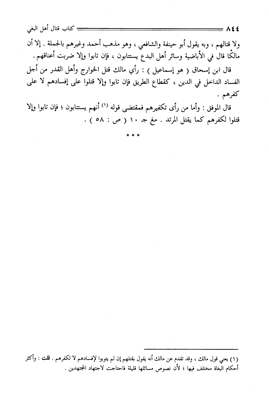 (¬1) يعني قول مالك، وقد تقدم عن مالك أنه يقول بقتلهم إن لم يتوبوا لإفسادهم لا لكفرهم. قلت: وأكثر أحكام البغاة مختلف فيها؛ لأن نصوص مسائلها قليلة فاحتاجت لاجتهاد المجتهدين.