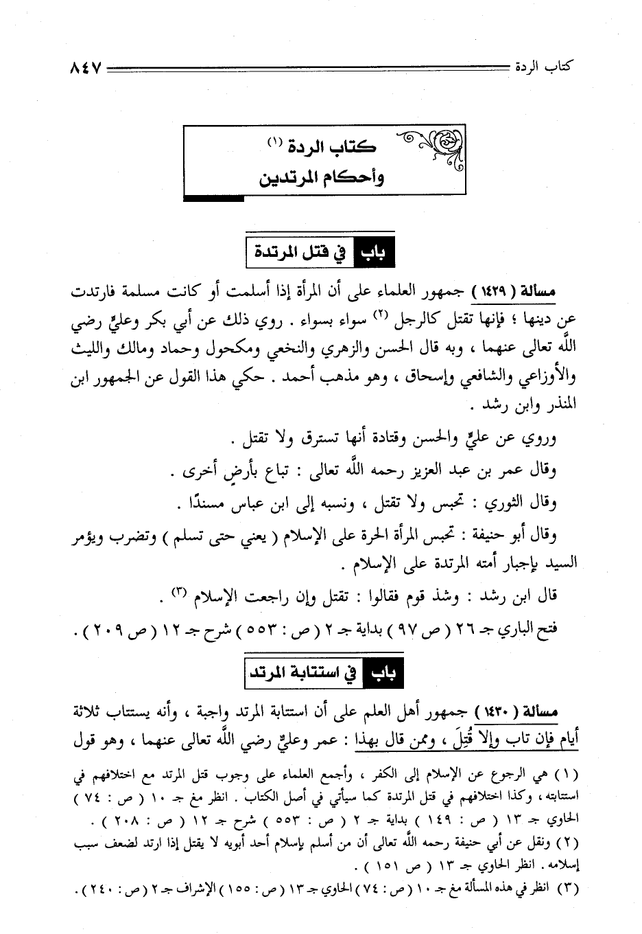 مسألة (1430) جمهور أهل العلم على أن استتابة المرتد واجبة، وأنه يستتاب ثلاثة أيام فإن تاب وإلا قتِلَ، وممن قال بهذا: عمر وعليِّ رضي اللَّه تعالى عنهما، وهو قول