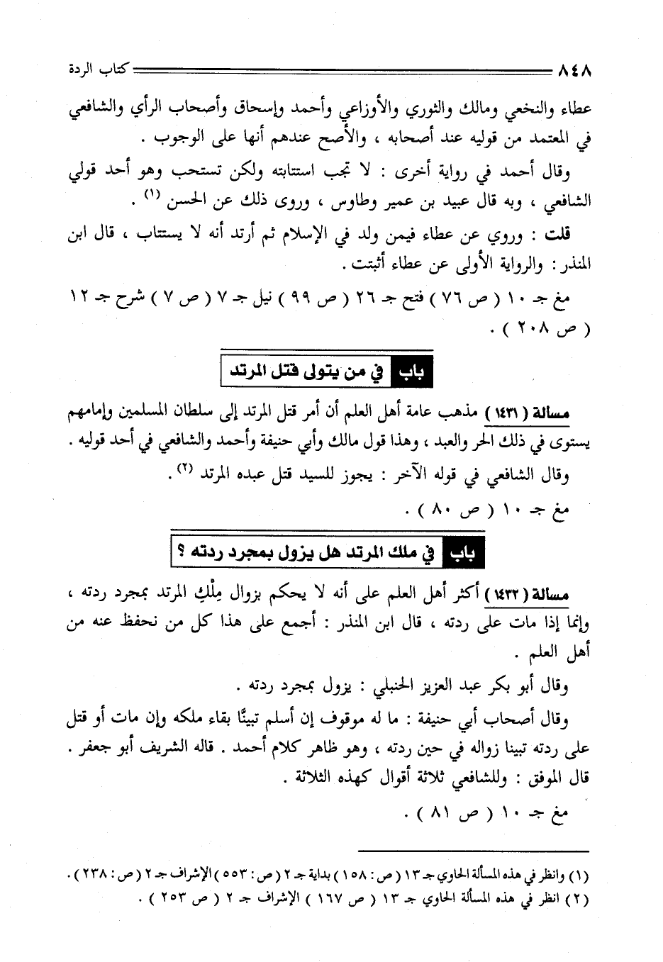 مسألة (1431) مذهب عامة أهل العلم أن أمر قتل المرتد إلى سلطان المسلمين وإمامهم يستوى في ذلك الحر والعبد، وهذا قول مالك وأبي حنيفة وأحمد والشافعي في أحد قوليه. وقال الشافعي في قوله الآخر: يجوز للسيد قتل عبده المرتد (¬2).