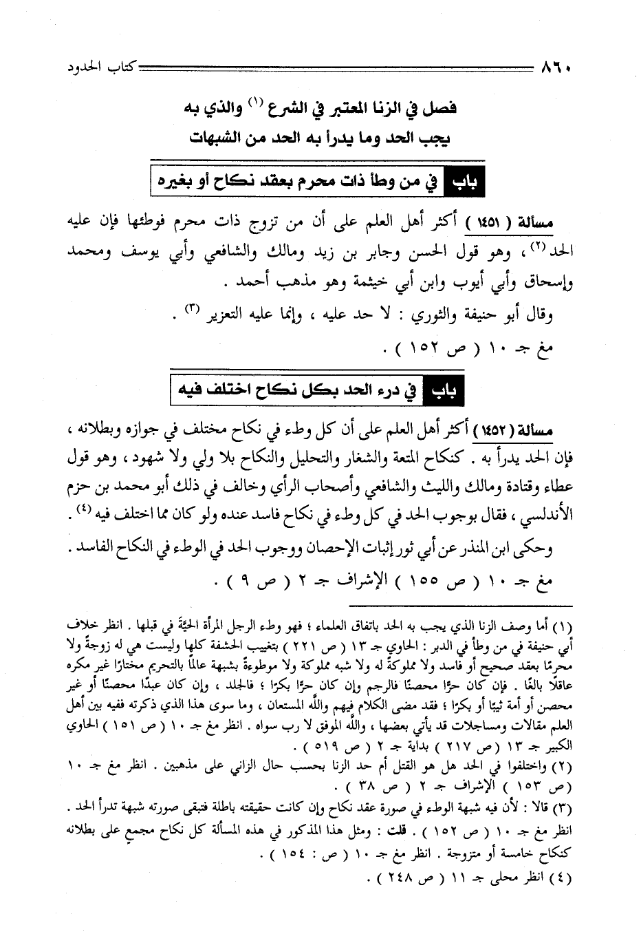 مسألة (1452) أكثر أهل العلم على أن كل وطء في نكاح مختلف في جوازه وبطلانه، فإن الحد يدرأ به. كنكاح المتعة والشغار والتحليل والنكاح بلا ولي ولا شهود، وهو قول عطاء وقتادة ومالك والليث والشافعي وأصحاب الرأي وخالف في ذلك أبو محمَّد بن حزم الأندلسي، فقال بوجوب الحد في كل وطء في نكاح فاسد عنده ولو كان مما اختلف فيه (¬4).