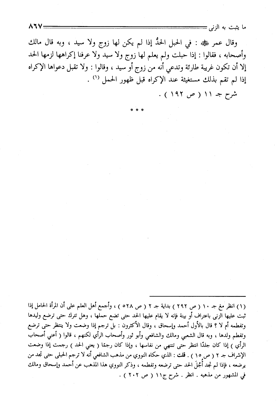 (¬1) انظر مغ جـ 10 (ص 292) بداية جـ 2 (ص 528)، وأجمع أهل العلم على أن المرأة الحامل إذا ثبت عليها الزنى باعتراف أو بينة فإنه لا يقام عليها الحد حتى تضع حملها، وهل تترك حتى ترضع وليدها وتفطمه أم لا؟ قال بالأول أحمد وإسحاق، وقال الأكثرون: بل ترجم إذا وضعت ولا ينتظر حتى ترضع وتفطم ولدها، وبه قال الشعبي ومالك والشافعي وأبو ثور وأصحاب الرأي لكنهم، قالوا (أعني أصحاب الرأي) إذا كان جلدًا انتظر حتى تنتهي من نفاسها، وإذا كان رجمًا (يعني الحد) رجمت إذا وضعت الإشراف جـ 2 (ص 15). قلت: الذي حكاه النووي من مذهب الشافعي أنه لا ترجم الحبلى حتى تجد من يرضعه، فإذا لم تجد أُجِّلَ الحد حتى ترضعه وتفطمه، وذكر النووي هذا المذهب عن أحمد وإسحاق ومالك في المشهور من مذهبه. انظر. شرح ج 11 (ص 202).