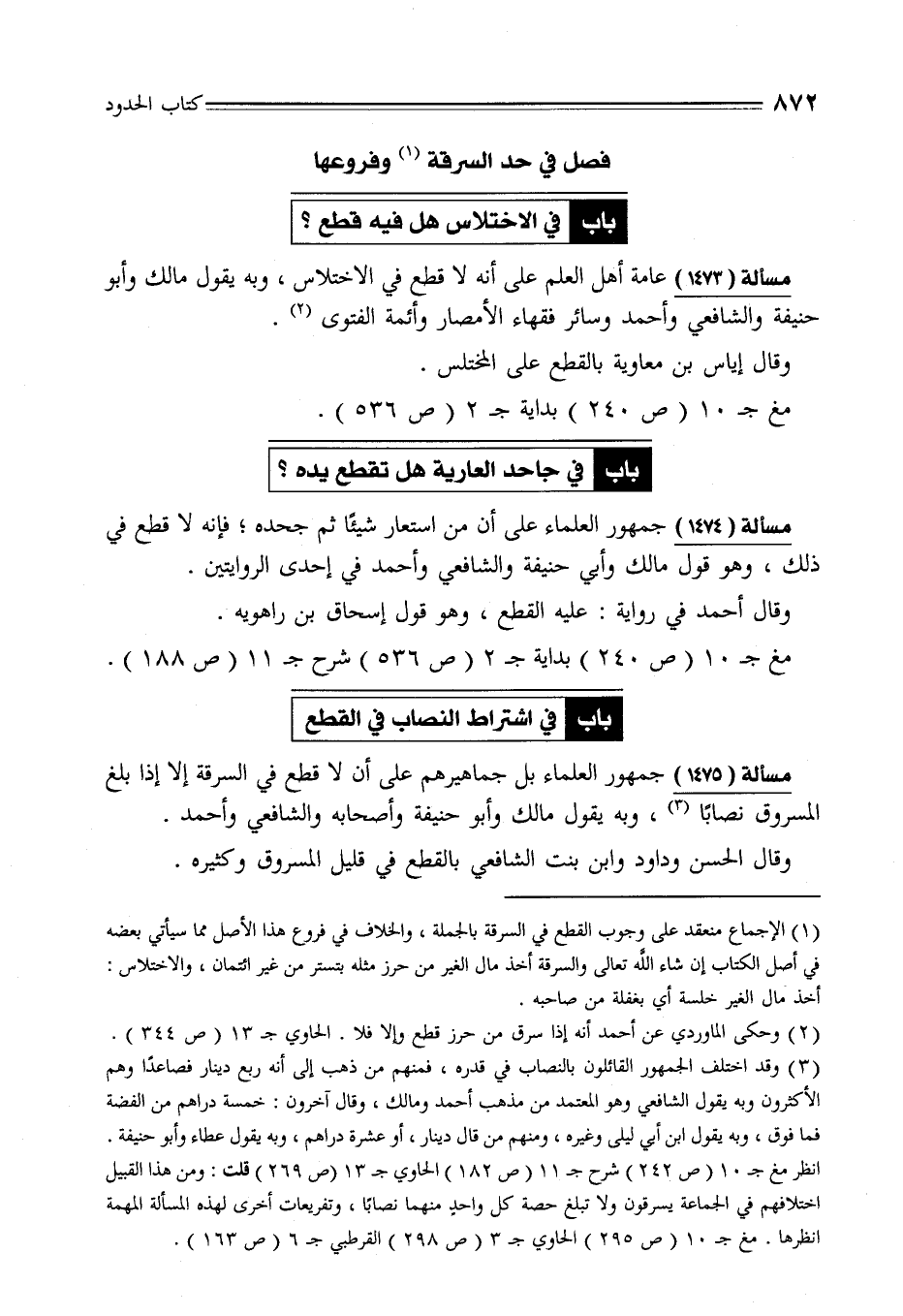 مسألة (1475) جمهور العلماء بل جماهيرهم على أن لا قطع في السرقة إلا إذا بلغ المسروق نصابًا (¬3)، وبه يقول مالك وأبو حنيفة وأصحابه والشافعي وأحمد.