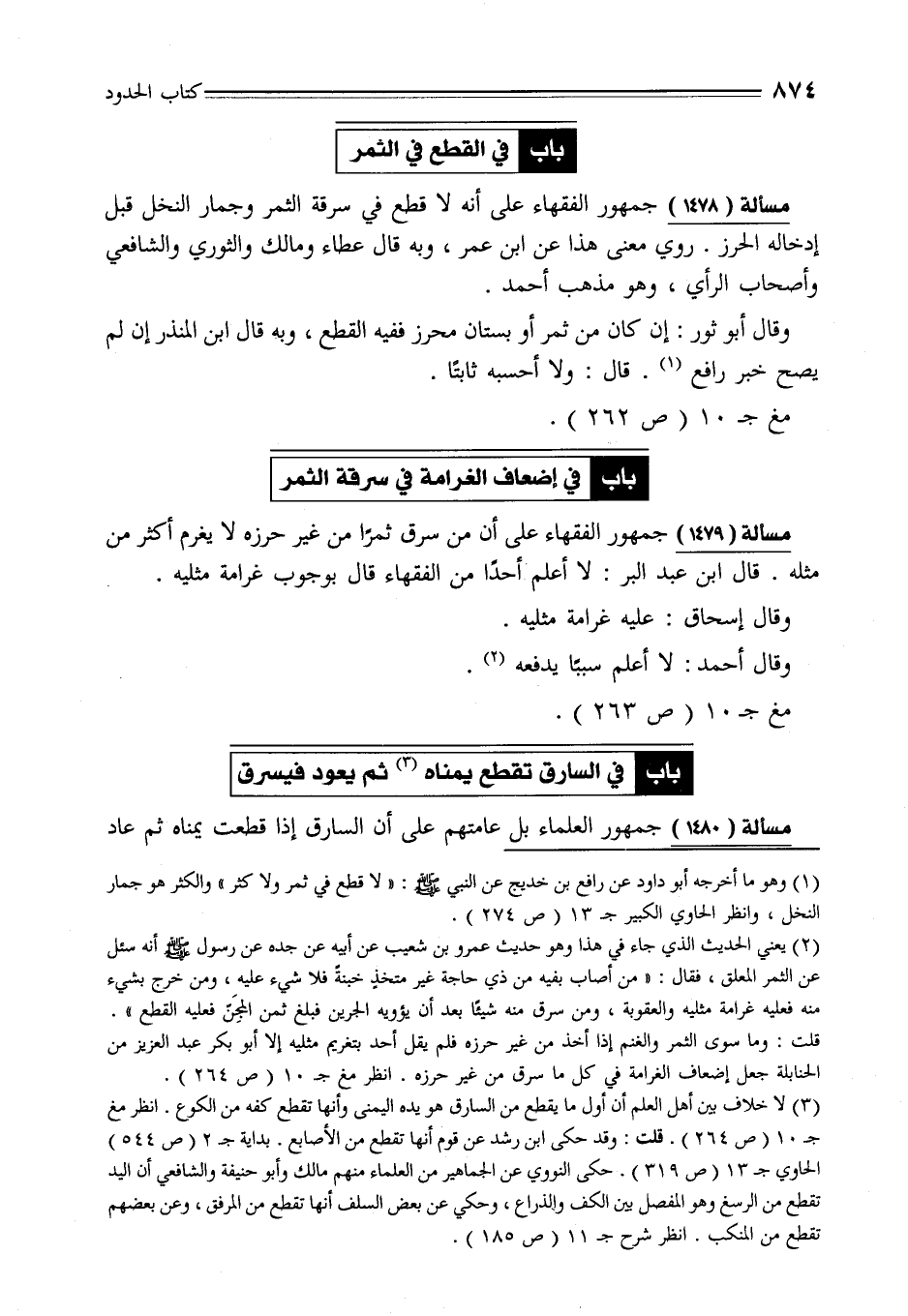 مسألة (1479) جمهور الفقهاء على أن من سرق ثمرًا من غير حرزه لا يغرم أكثر من مثله. قال ابن عبد البر: لا أعلم أحدًا من الفقهاء قال بوجوب غرامة مثليه.