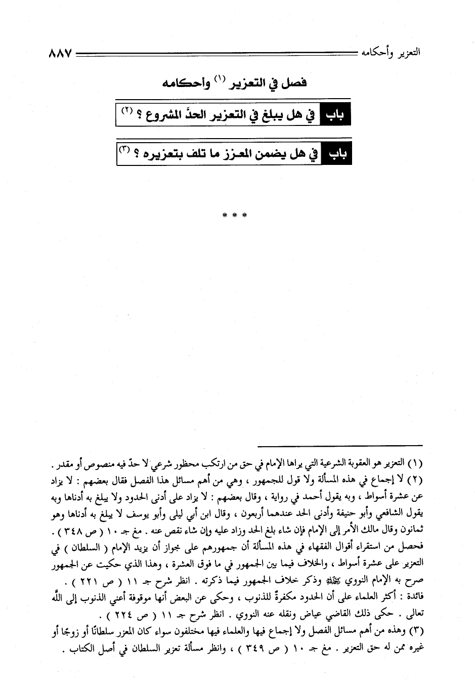 (¬3) وهذه من أهم مسائل الفصل ولا اجماع فيها والعلماء فيها مختلفون سواء كان المعزر سلطانًا أو زوجًا أو غيره ممن له حق التعزير. مغ جـ 10 (ص 349)، وانظر مسألة تعزير السلطان في أصل الكتاب.
