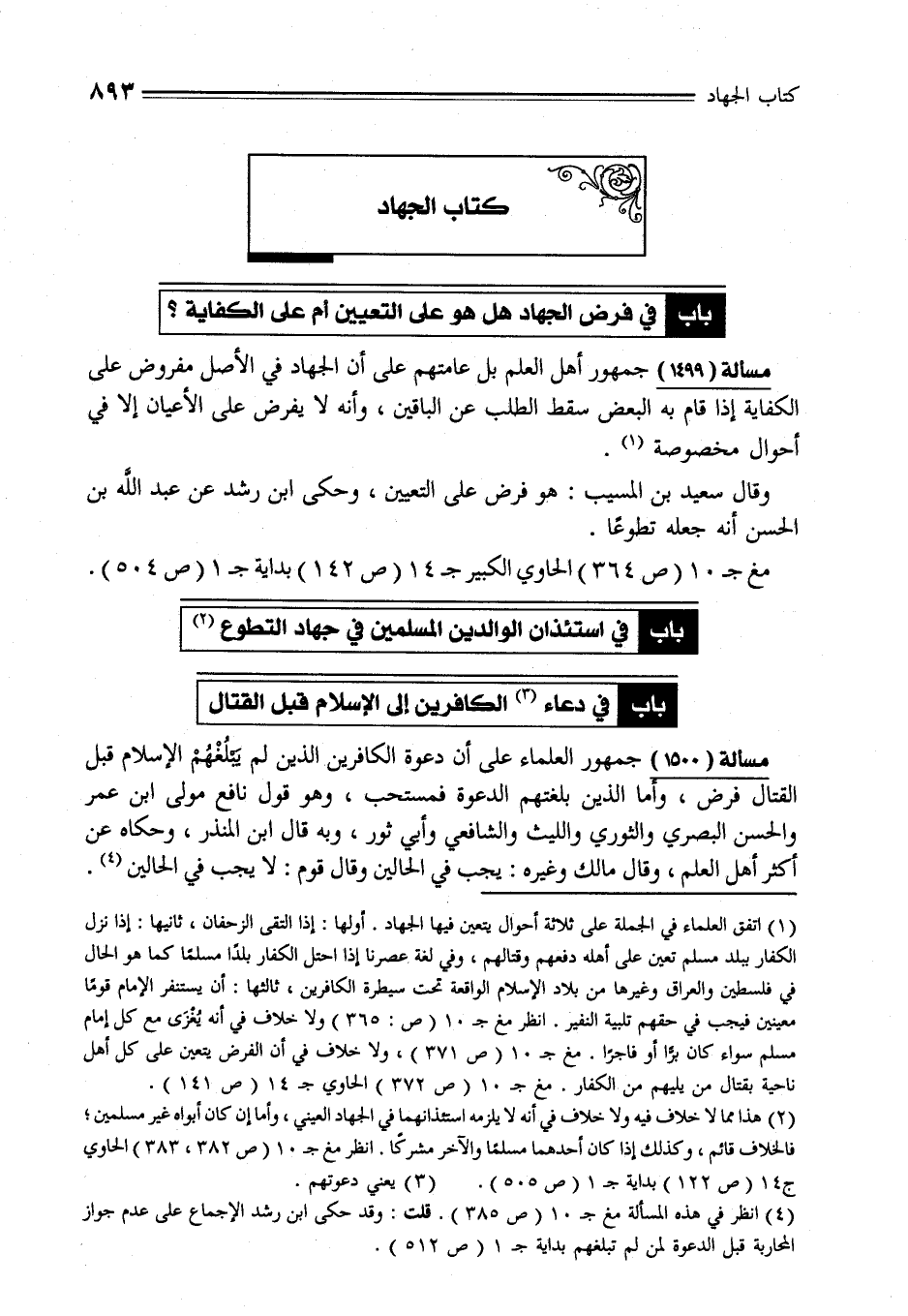 مسألة (1499) جمهور أهل العلم بل عامتهم على أن الجهاد في الأصل مفروض على الكفاية إذا قام به البعض سقط الطلب عن الباقين، وأنه لا يفرض على الأعيان إلا في أحوال مخصوصة (¬1).