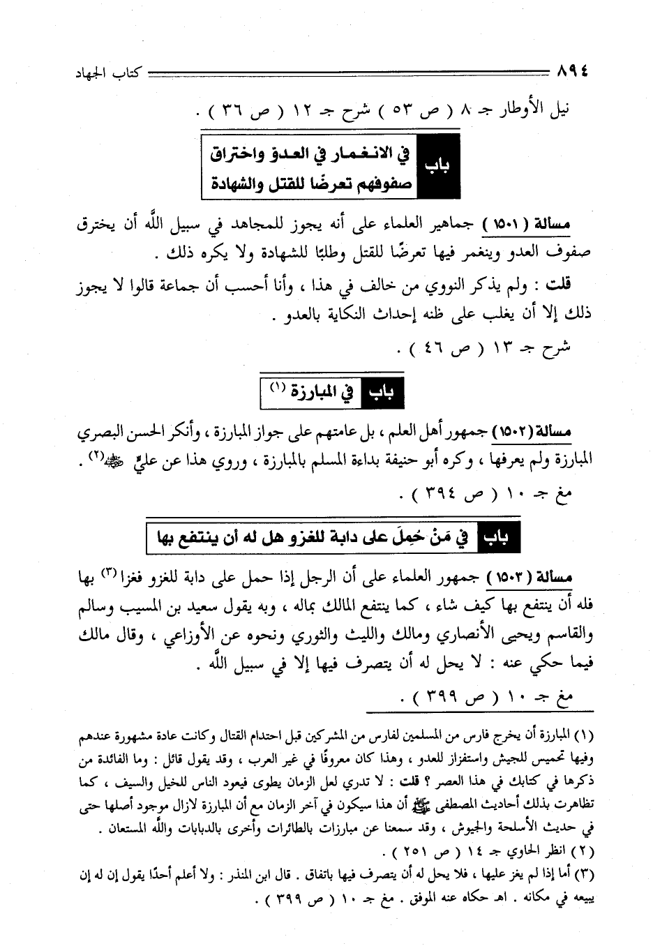 مسألة (1501) جماهير العلماء على أنه يجوز للمجاهد في سبيل الله أن يخترق صفوف العدو وينغمر فيها تعرضًا للقتل وطلبًا للشهادة ولا يكره ذلك.