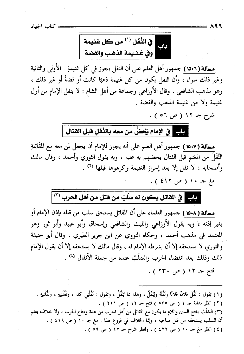 مسألة (1506) جمهور أهل العلم على أن النفل يجوز في كل غنيمةٍ. الأولى والثانية وغير ذلك سواء، وأن النفل يكون من كل غنيمة ذهبًا كانت أو فضةً أو غير ذلك، وهو مذهب الشافعي، وقال الأوزاعي وجماعة من أهل الشام: لا ينفل الإِمام من أول غنيمة ولا من غنيمة الذهب والفضة.