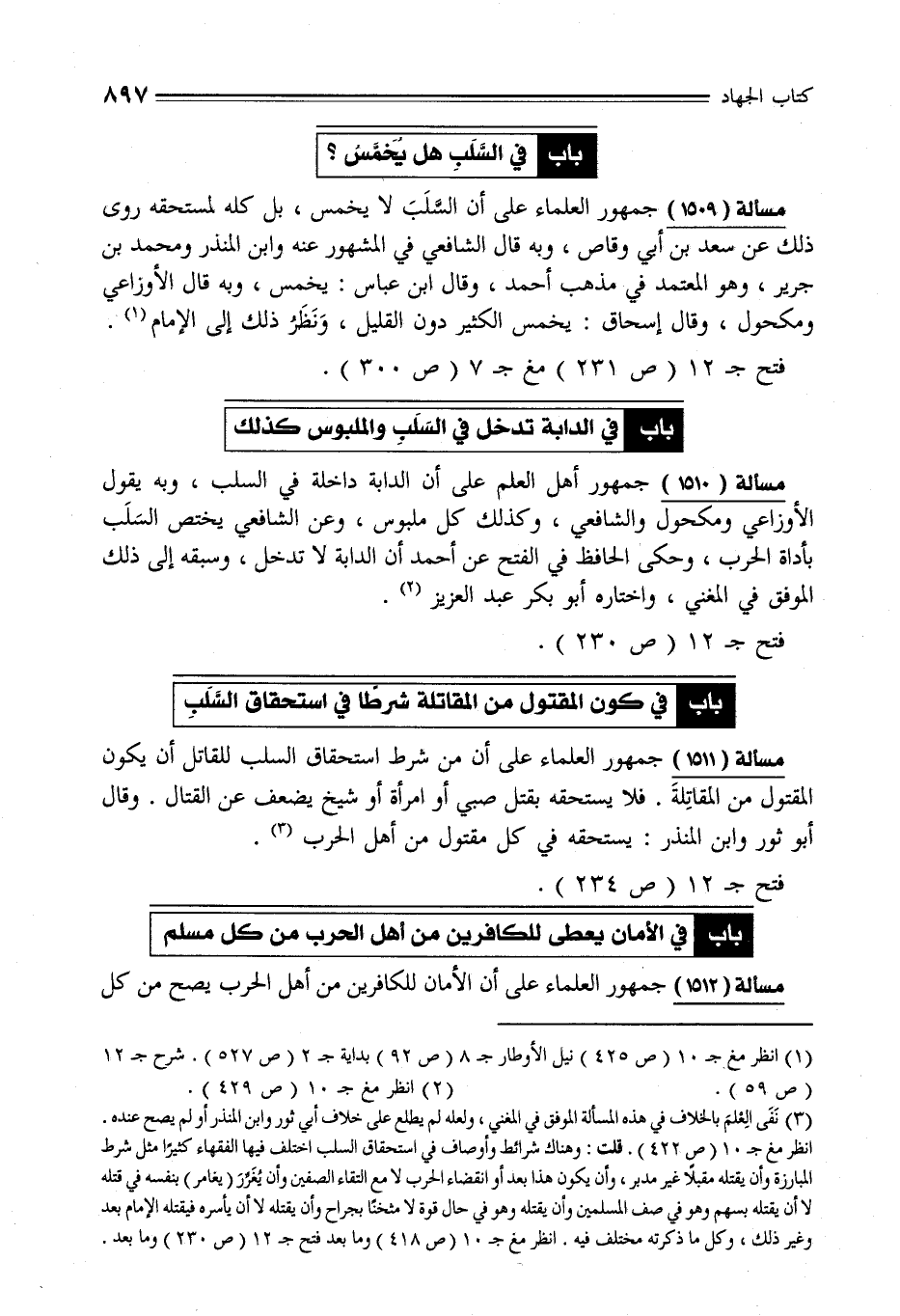 (¬3) نَفَى الِعْلمَ بالخلاف في هذه المسألة الموفق في المغني، ولعله لم يطلع على خلاف أبي ثور وابن المنذر أو لم يصح عنده. انظر مغ جـ 10 (ص 422). قلت: وهناك شرائط وأوصاف في استحقاق السلب اختلف فيها الفقهاء كثيرًا مثل شرط المبارزة وأن يقتله مقبلًا غير مدبر، وأن يكون هذا بعد أو انقضاء الحرب لا مع التقاء الصفين وأن يُغَرَّرَ (يغامر) بنفسه في قتله لا أن يقتله بسهم وهو في صف المسلمين وأن يقتله وهو في حال قوة لا مثخنًا بجراح وأن يقتله لا أن يأسره فيقتله الإمام بعد وغير ذلك، وكل ما ذكرته مختلف فيه. انظر مغ جـ 10 (ص 418) وما بعد فتح جـ 12 (ص 230) وما بعد.