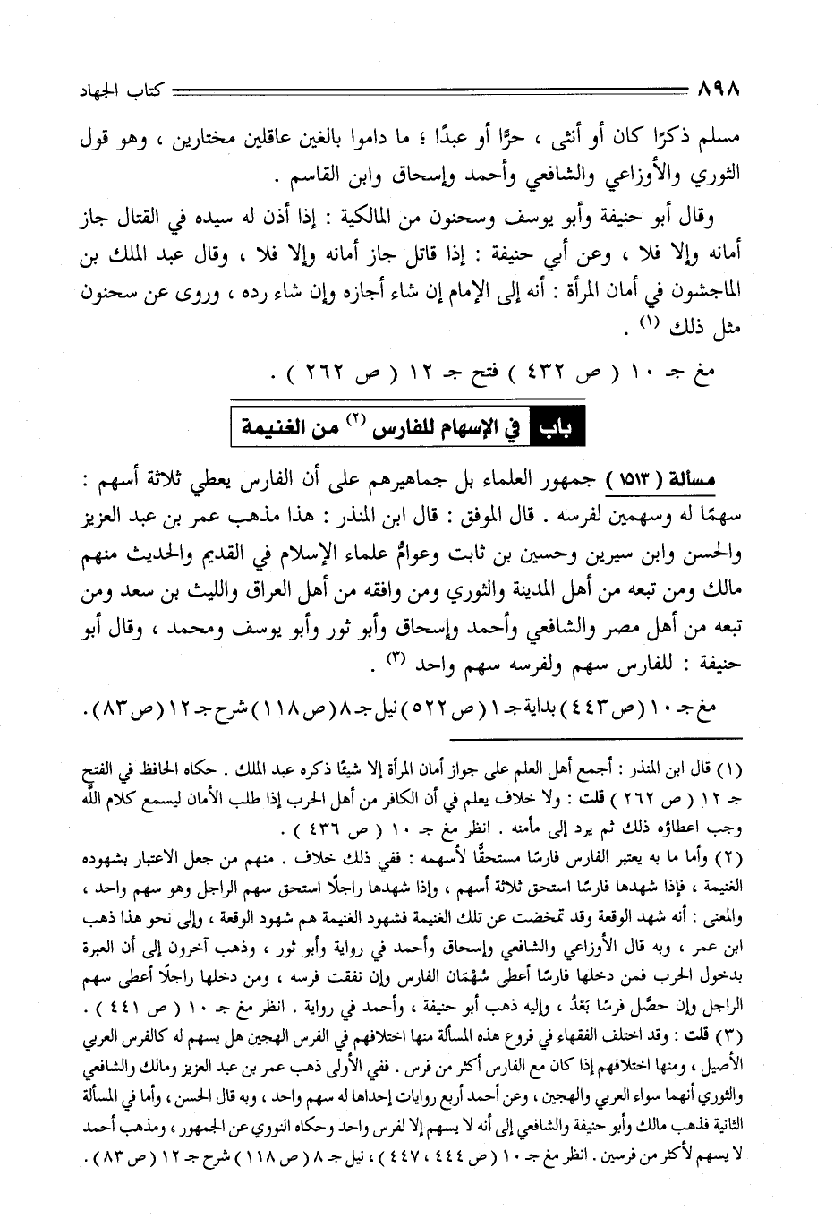 (¬3) قلت: وقد اختلف الفقهاء في فروع هذه المسألة منها اختلافهم في الفرس الهجين هل يسهم له كالفرس العربي الأصيل، ومنها اختلافهم إذا كان مع الفارس أكثر من فرس. ففي الأولى ذهب عمر بن عبد العزيز ومالك والشافعي والثوري أنهما سواء العربي والهجين، وعن أحمد أربع روايات إحداها له سهم واحد، وبه قال الحسن، وأما في المسألة الثانية فذهب مالك وأبو حنيفة والشافعي إلى أنه لا يسهم إلا لفرس واحد وحكاه النووي عن الجمهور، ومذهب أحمد لا يسهم لأكثر من فرسين. انظر مغ جـ 10 (ص 444، 447)، نيل جـ 8 (ص 118) شرح جـ 12 (ص 83).