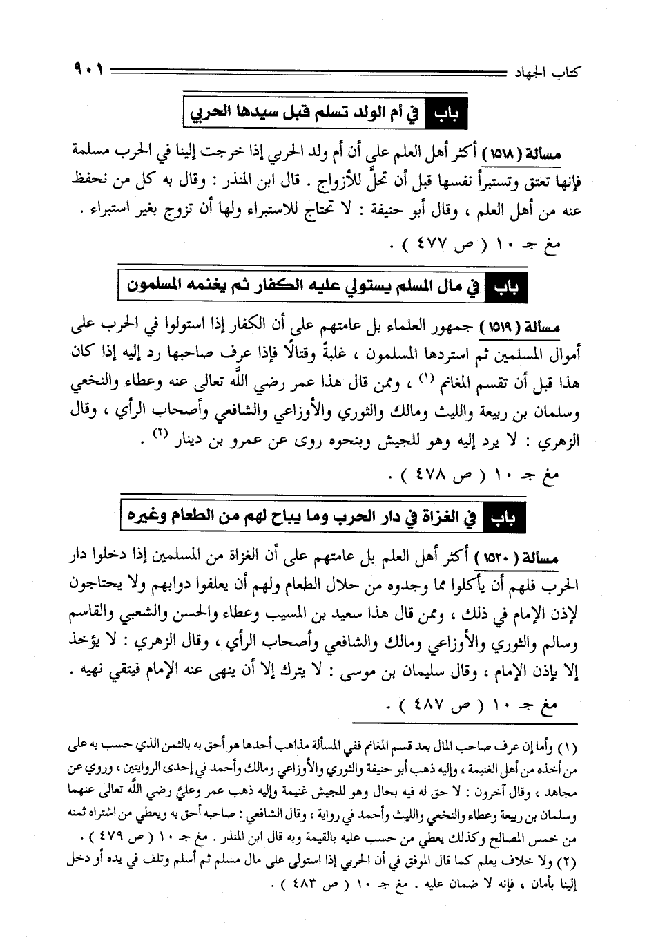 مسألة (1519) جمهور العلماء بل عامتهم على أن الكفار إذا استولوا في الحرب على أموال المسلمين ثم استردها المسلمون، غلبة وقتالًا فإذا عرف صاحبها رد إليه إذا كان هذا قبل أن تقسم المغانم (¬1)، وممن قال هذا عمر رضي الله تعالى عنه وعطاء والنخعي وسلمان بن ربيعة والليث ومالك والثوري والأوزاعي والشافعي وأصحاب الرأي، وقال الزهري: لا يرد إليه وهو للجيش وبنحوه روى عن عمرو بن دينار (¬2).