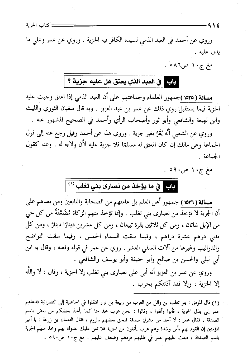 مسألة (1536) جمهور أهل العلم بل عامتهم من الصحابة والتابعين ومن بعدهم على أن الجزية لا تؤخذ من نصارى بني تغلب. وإنما تؤخذ منهم الزكاة مُضَعَّفَةً من كل حي من الإبل شاتان، ومن كل ثلاثين بقرة تبيعان، ومن كل عشرين دينارًا دينارٌ، ومن كل مئتي درهم عشرة دراهم، وفيما سقت السماء الخمس، وفيما سقت النواضح والدواليب وغيرها من آلات السقي العشر. روي عن عمر في قوله وفعله، وقال به ابن أبي ليلى والحسن بن صالح وأبو حنيفة وأبو يوسف والشافعي.