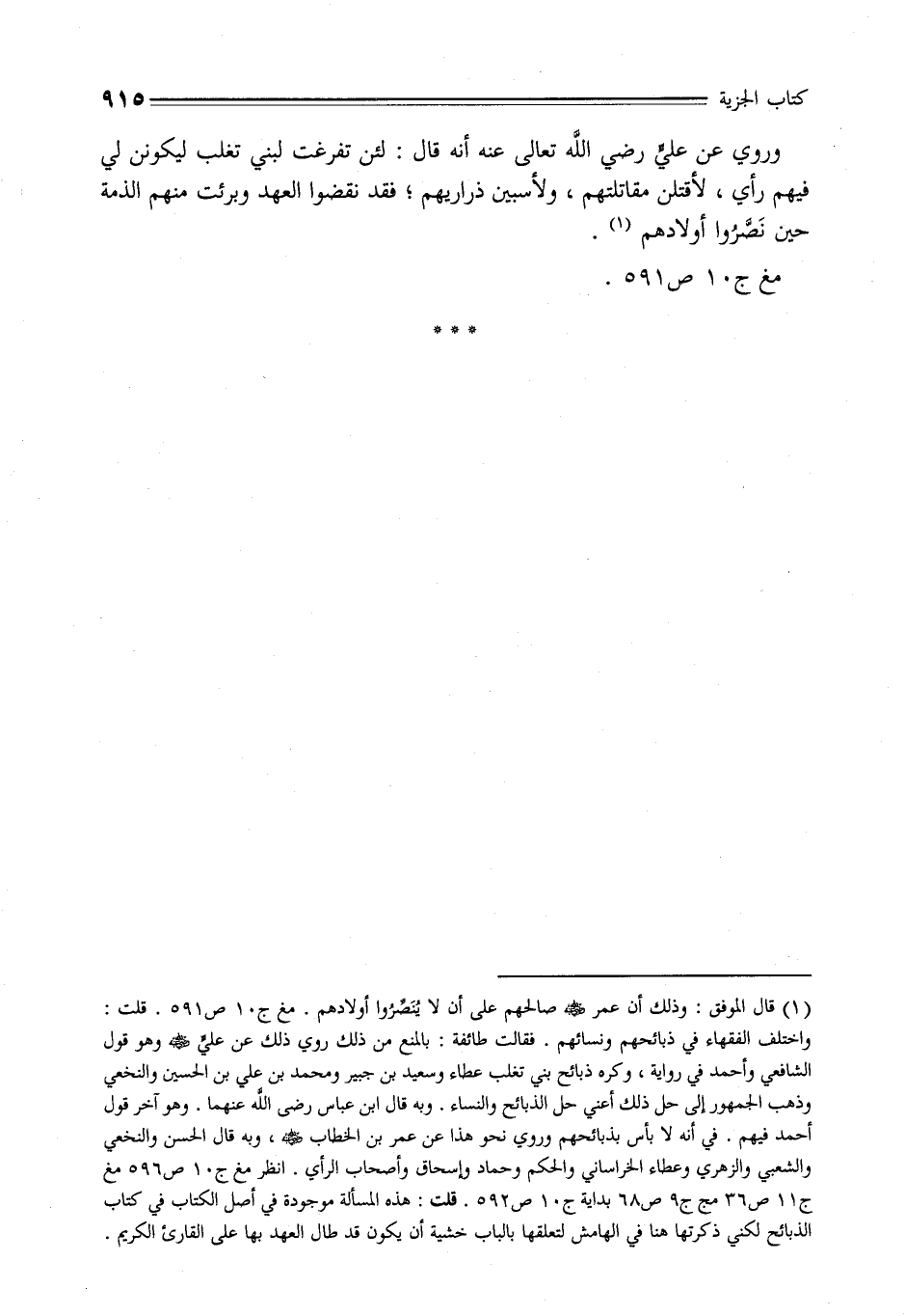 (¬1) قال الموفق: وذلك أن عمر - رضي الله عنه - صالحهم على أن لا يُنَصِّرُوا أولادهم. مغ ج 10 ص 591. قلت: واختلف الفقهاء في ذبائحهم ونسائهم. فقالت طائفة: بالمنع من ذلك روي ذلك عن عليٍّ - رضي الله عنه - وهو قول الشافعي وأحمد في رواية، وكره ذبائح بني تغلب عطاء وسعيد بن جبير ومحمد بن علي بن الحسين والنخعي وذهب الجمهور إلى حل ذلك أعني حل الذبائح والنساء. وبه قال ابن عباس رضي الله عنهما. وهو آخر قول أحمد فيهم. في أنه لا بأس بذبائحهم وروي نحو هذا عن عمر بن الخطاب - رضي الله عنه -، وبه قال الحسن والنخعي والشعبي والزهري وعطاء الخراساني والحكم وحماد وإسحاق وأصحاب الرأي. انظر مغ ج 10 ص 596 مغ ج 11 ص 36 مج ج 9 ص 68 بداية ج 10 ص 592. قلت: هذه المسألة موجودة في أصل الكتاب في كتاب الذبائح لكني ذكرتها هنا في الهامش لتعلقها بالباب خشية أن يكون قد طال العهد بها على القارئ الكريم.