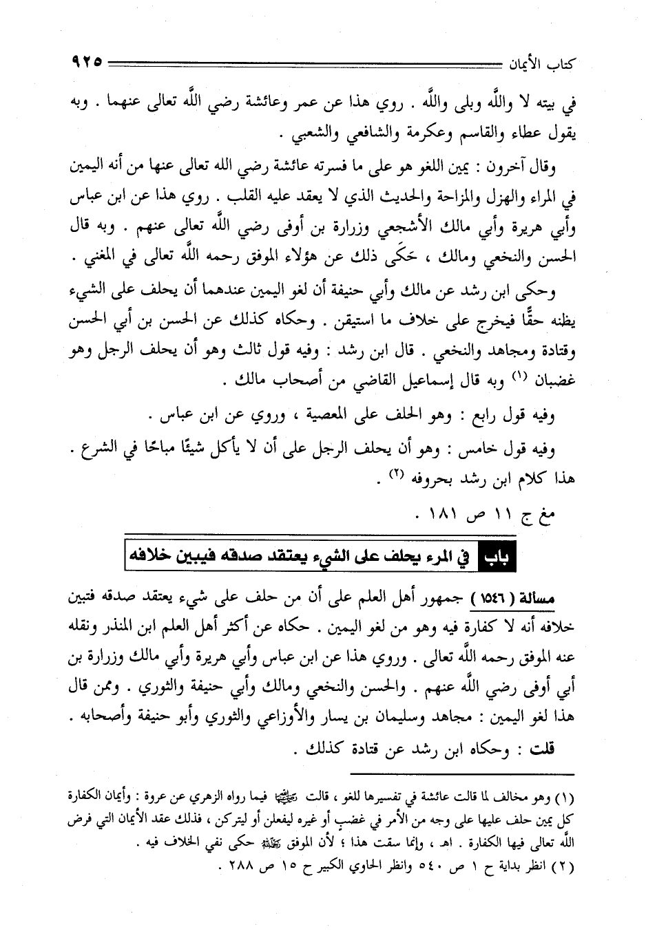 (¬1) وهو مخالف لما قالت عائشة في تفسيرها للغو، قالت - رضي الله عنه - فيما رواه الزهري عن عروة: وأيمان الكفارة كل يمين حلف عليها على وجه من الأمر في غضبٍ أو غيره ليفعلن أو ليتركن، فذلك عقد الأيمان التي فرض الله تعالى فيها الكفارة. اهـ، وإنما سقت هذا؛ لأن الموفق -رحمه الله- حكى نفي الخلاف فيه.