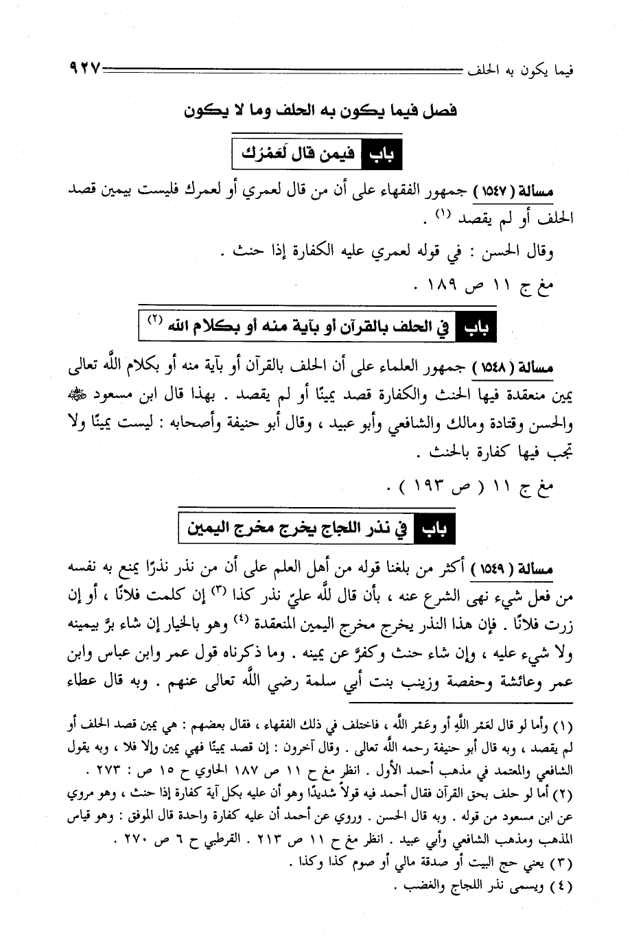 مسألة (1547) جمهور الفقهاء على أن من قال لعمري أو لعمرك فليست بيمين قصد الحلف أو لم يقصد (¬1).