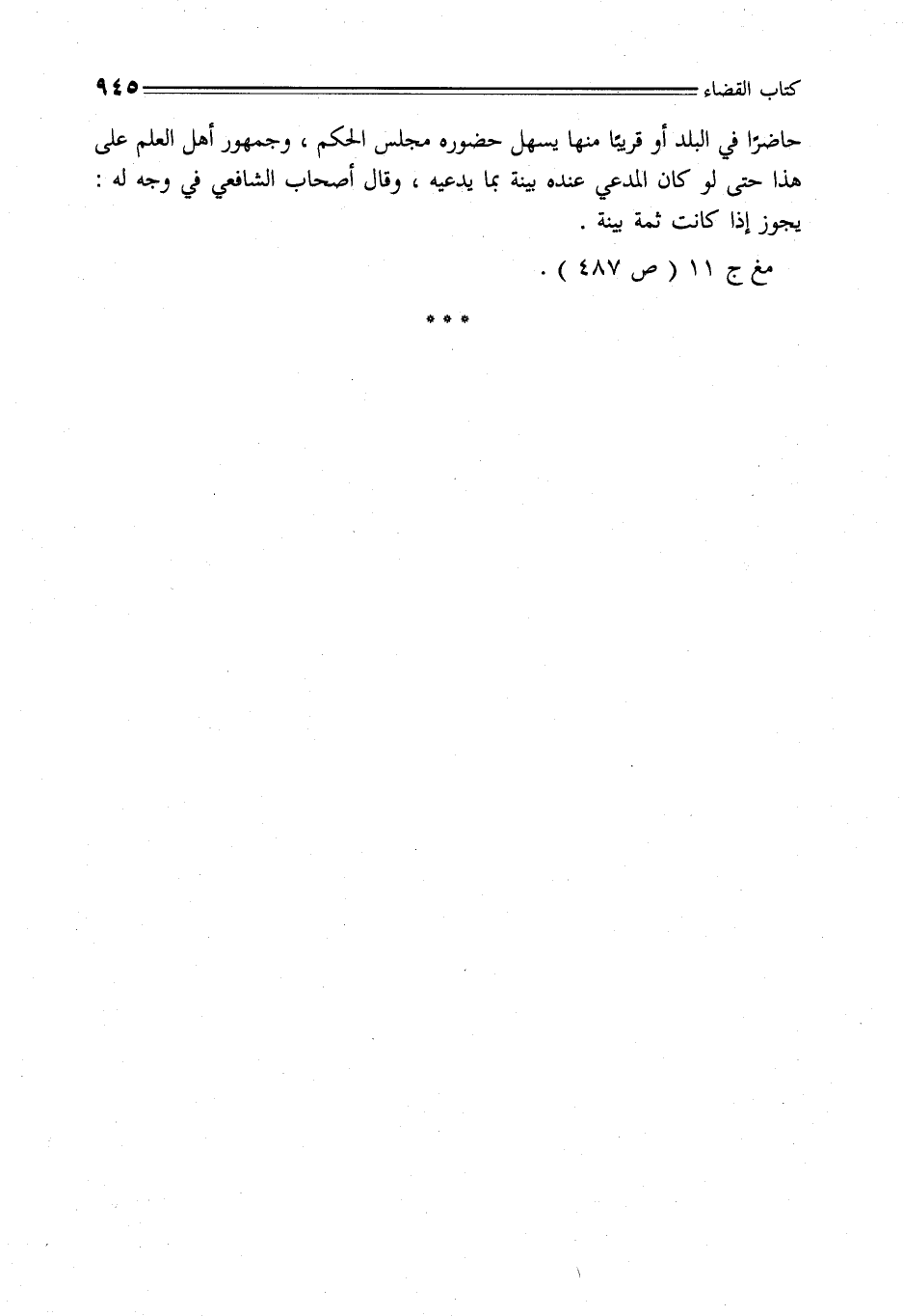 حاضرًا في البلد أو قريبًا منها يسهل حضوره مجلس الحكم، وجمهور أهل العلم على هذا حتى لو كان المدعي عنده بينة بما يدعيه، وقال أصحاب الشافعي في وجه له: يجوز إذا كانت ثمة يينة.
