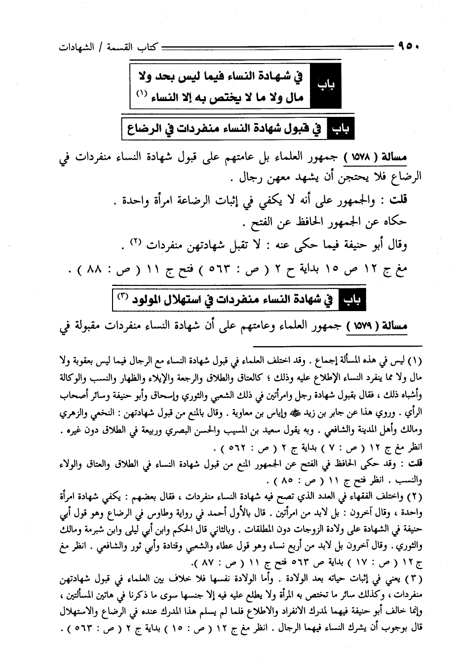 مسألة (1579) جمهور العلماء وعامتهم على أن شهادة النساء منفردات مقبولة في