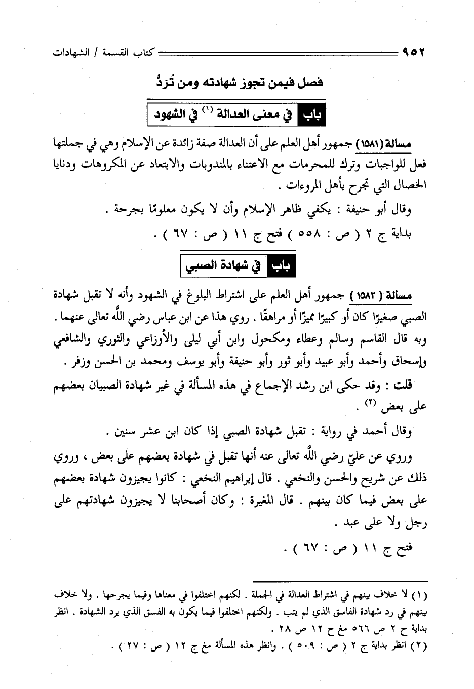 (¬1) لا خلاف بينهم في اشتراط العدالة في الجملة. لكنهم اختلفوا في معناهاوفيما يجرحها. ولا خلاف بينهم في رد شهادة الفاسق الذي لم يتب. ولكنهم اختلفوا فيما يكون به الفسق الذي يرد الشهادة. انظر بداية ح2 ص 566 مغ خ 12 ص 28.