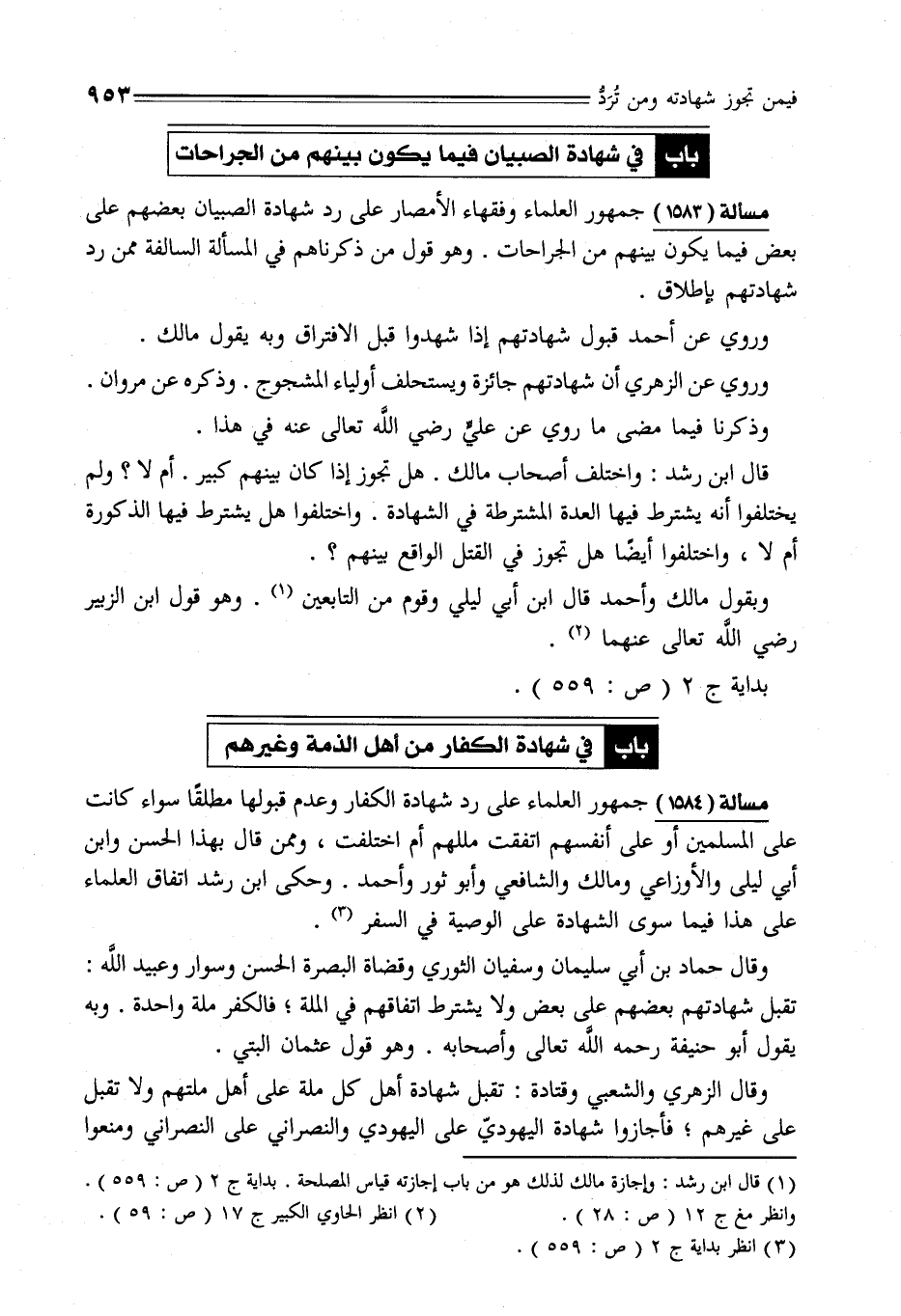 مسألة (1584) جمهور العلماء على رد شهادة الكفار وعدم قبولها مطلقًا سواء كانت على المسلمين أو على أنفسهم اتفقت مللهم أم اختلفت، وممن قال بهذا الحسن وابن أبي ليلى والأوزاعي ومالك والشافعي وأبو ثور وأحمد. وحكى ابن رشد اتفاق العلماء على هذا فيما سوى الشهادة على الوصية في السفر (¬3).