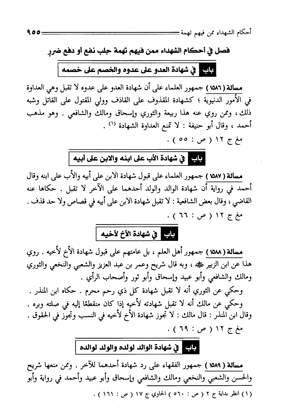 مسألة (1589) جمهور الفقهاء على رد شهادة أحدهما للآخر. وممن منعها شريح والحسن والشعبي والنخعي ومالك والشافعي وإسحاق وأبو عبيد وأحمد في رواية وأبو