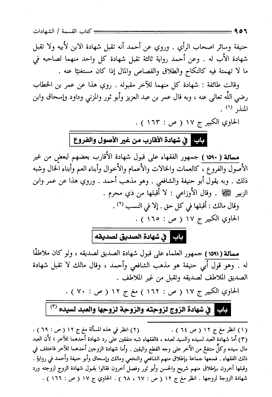 مسألة (1590) جمهور الفقهاء على قبول شهادة الأقارب بعضهم لبعضٍ من غير الأصول والفروع، كالعمات والخالات والأعمام والأخوال وأبناء العم وأبناء الخال وشبه ذلك. وبه يقول أبو حنيفة والشافعىِ. وهو مذهب أحمد. وروي هذا عن عمر وابن الزبير رضي الله عنهما وقال الأوزاعي: لا أقبلها من ذي محرم.