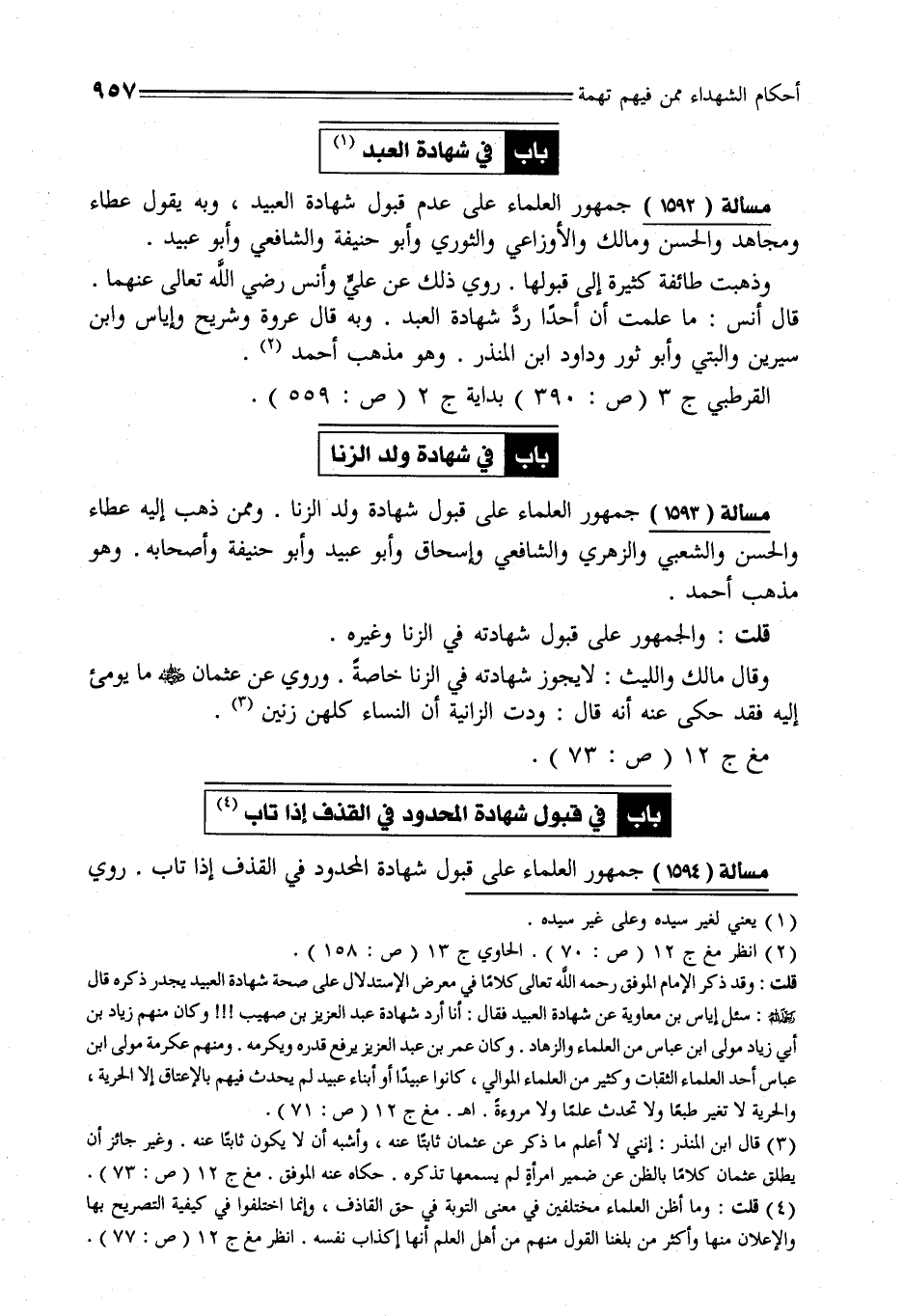 مسألة (1592) جمهور العلماء على عدم قبول شهادة العبيد، وبه يقول عطاء ومجاهد والحسن ومالك والأوزاعي والثوري وأبو حنيفة والشافعي وأبو عبيد.