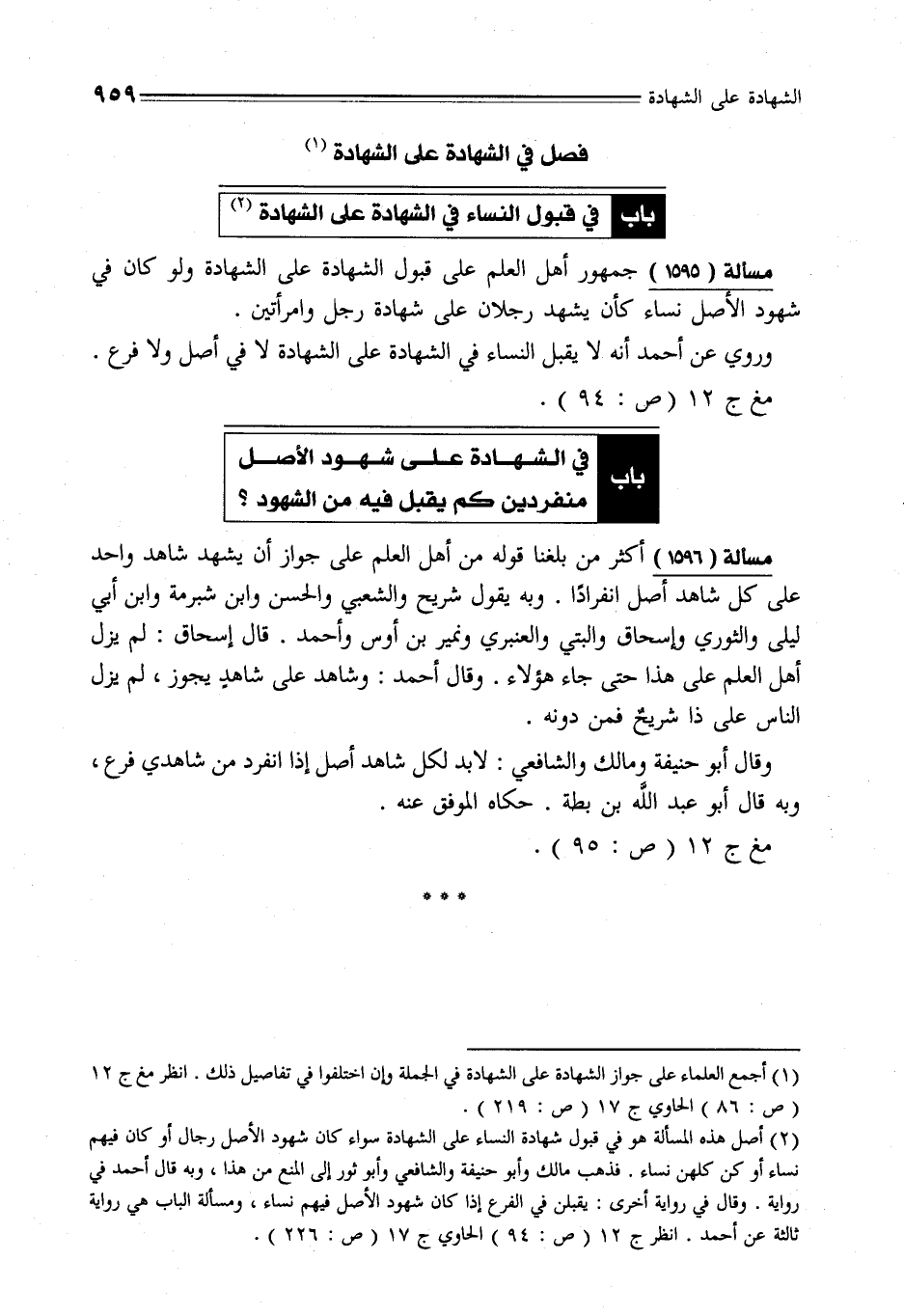 مسألة (1595) جمهور أهل العلم على قبول الشهادة على الشهادة ولو كان في شهود الأصل نساء كأن يشهد رجلان على شهادة رجل وامرأتين.