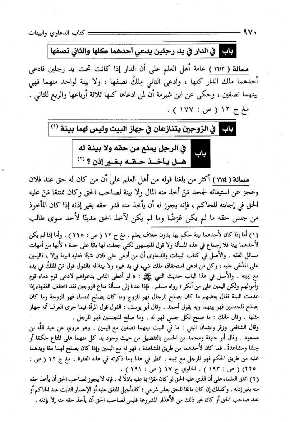 (¬1) أما إذا كان لأحدهما بينة حكم بها بدون خلاف يعلم. مغ ح 12 (ص: 225). وأما إذا لم يكن لأحدهما بينة فلا إجماع في هذه المسألة ولا قول للجمهور لكني جعلت لها بابًا على حدة؛ لأنها من أمهات مسائل الفقه. والأصل في كتاب البينات والدعاوى أن من أدعى على فلان شيئًا فعليه البينة وإلا، فاليمين علي المدَّعَى عليه، وكل من ادعى استحقاق ملك شيء في يد غيره ولا بينة له فالقول قول مَنْ الملكُ في يده مع يمينه. والأصل في هذا الباب حديث النبي - صلى الله عليه وسلم -: "لو أعطى الناس بدعواهم لادعى قوم دماء قوم وأموالهم ولكن اليمين على من أنكر" رواه مسلم. فإذا عدنا إلى مسألة متاع الزوجين فقد اختلف الفقهاء إذا عدمت البينة فقال بعضهم ما كان يصلح للرجال فهو للزوج وما كان يصلح للنساء فهو للزوجة وما كان يصلح للجنسين فهو بينهما وبه يقول أحمد. وقال أبو يوسف: القول قول المرأة فيما جرى العرف أنه جهاز مثلها. وقال مالك: ما صلح لكل جنس فهو له. وما صلح للجنسين فهو للرجل.