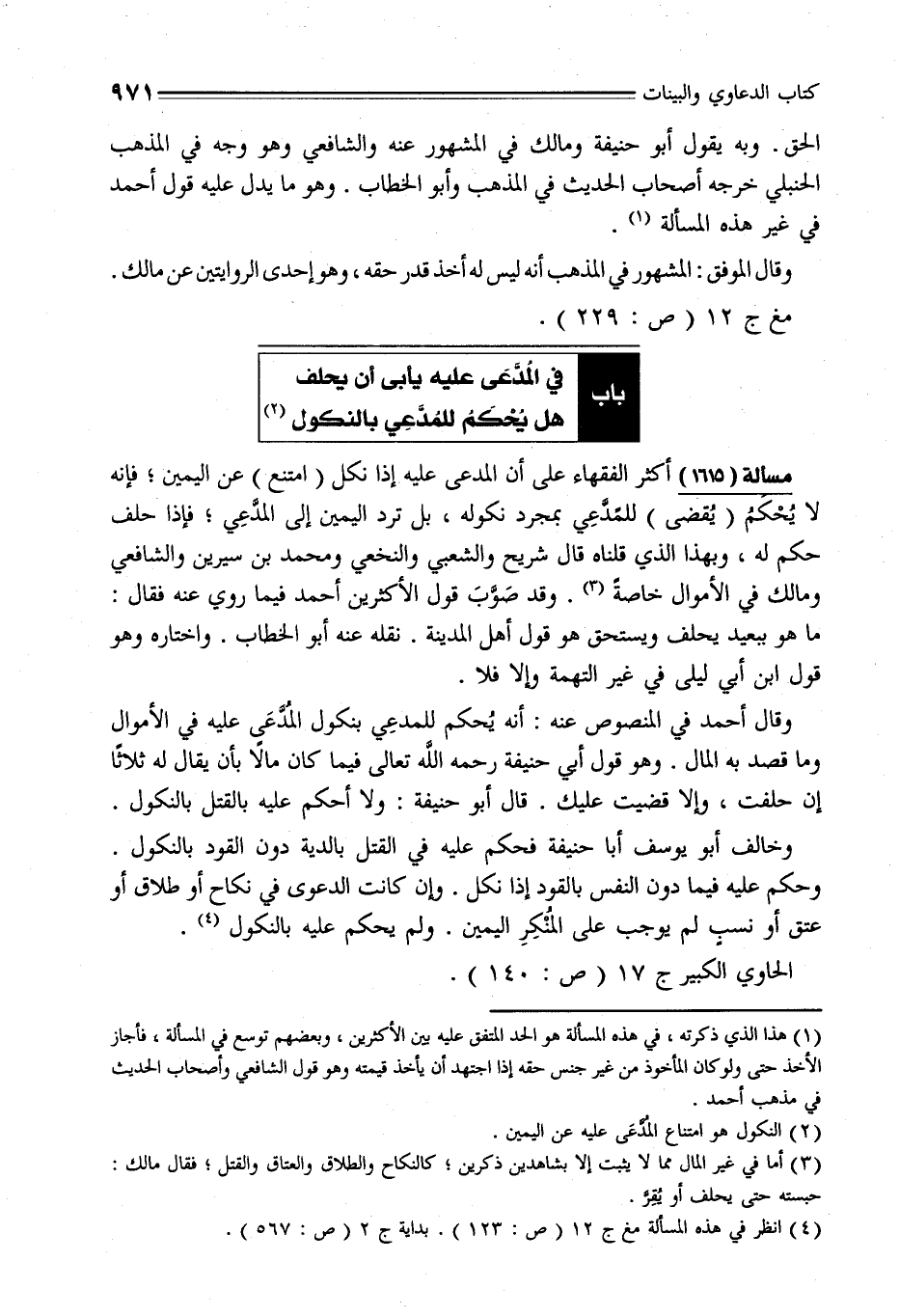 وخالف أبو يوسف أبا حنيفة فحكم عليه في القتل بالدية دون القود بالنكول. وحكم عليه فيما دون النفسى بالقود إذا نكل. وإن كانت الدعوى في نكاح أو طلاق أو عتق أو نسبٍ لم يوجب على المُنْكِرِ اليمين. ولم يحكم عليه بالنكول (¬4).