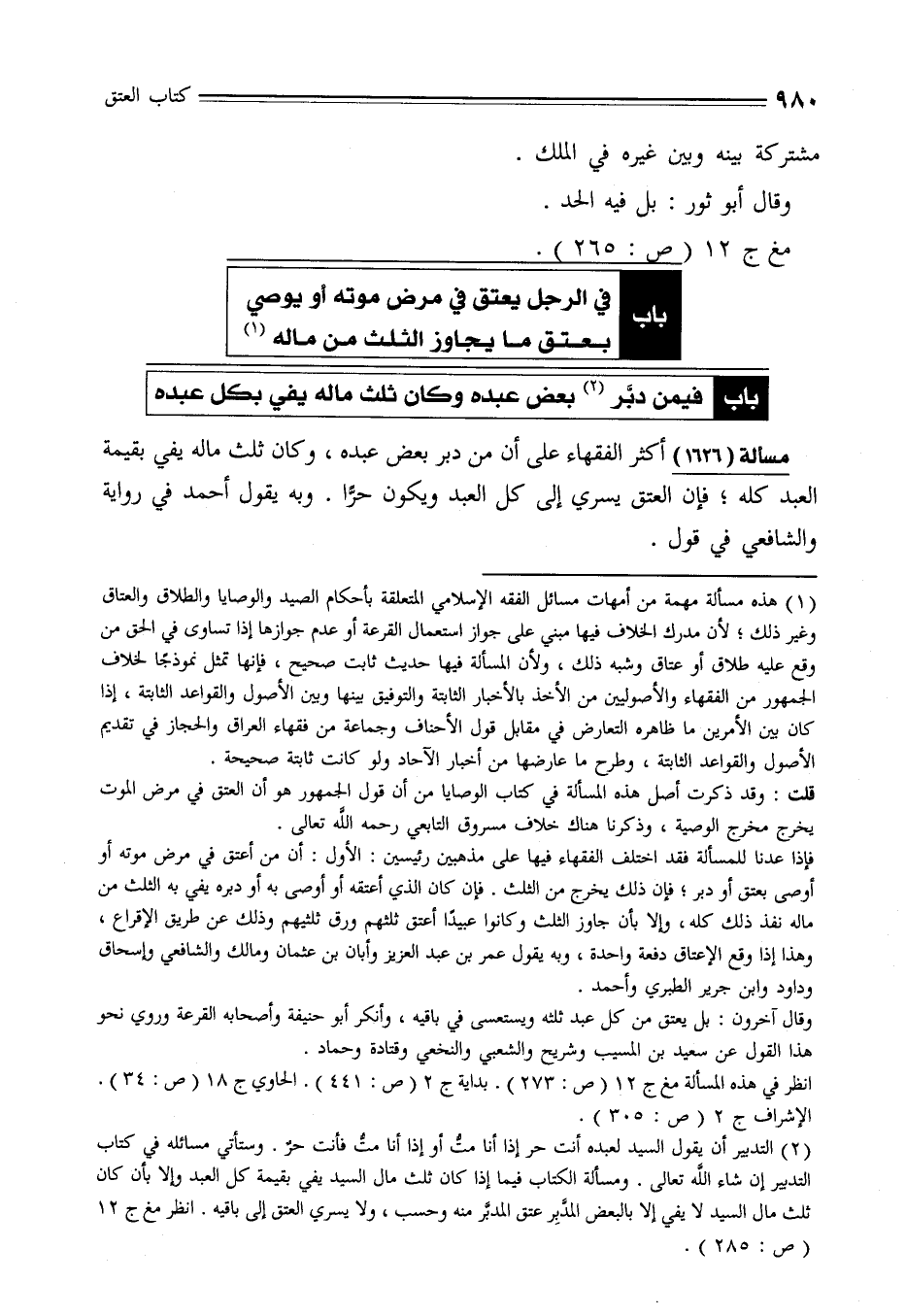 (¬2) التديير أن يقول السيد لعبده أنت حر إذا أنا متُّ أو إذا أنا متُّ فأنت حرٌ. وستأتي مسائله في كتاب التدبير إن شاء الله تعالى. ومسألة الكتاب فيما إذا كان ثلث مال السيد يفي بقيمة كل العبد وإلا بأن كان ثلث مال السيد لا يفي إلا بالبعض المدَّبِر عتق المدبَّر منه وحسب، ولا يسري العتق إلى باقيه. انظر مغ ج 12 (ص: 285).
