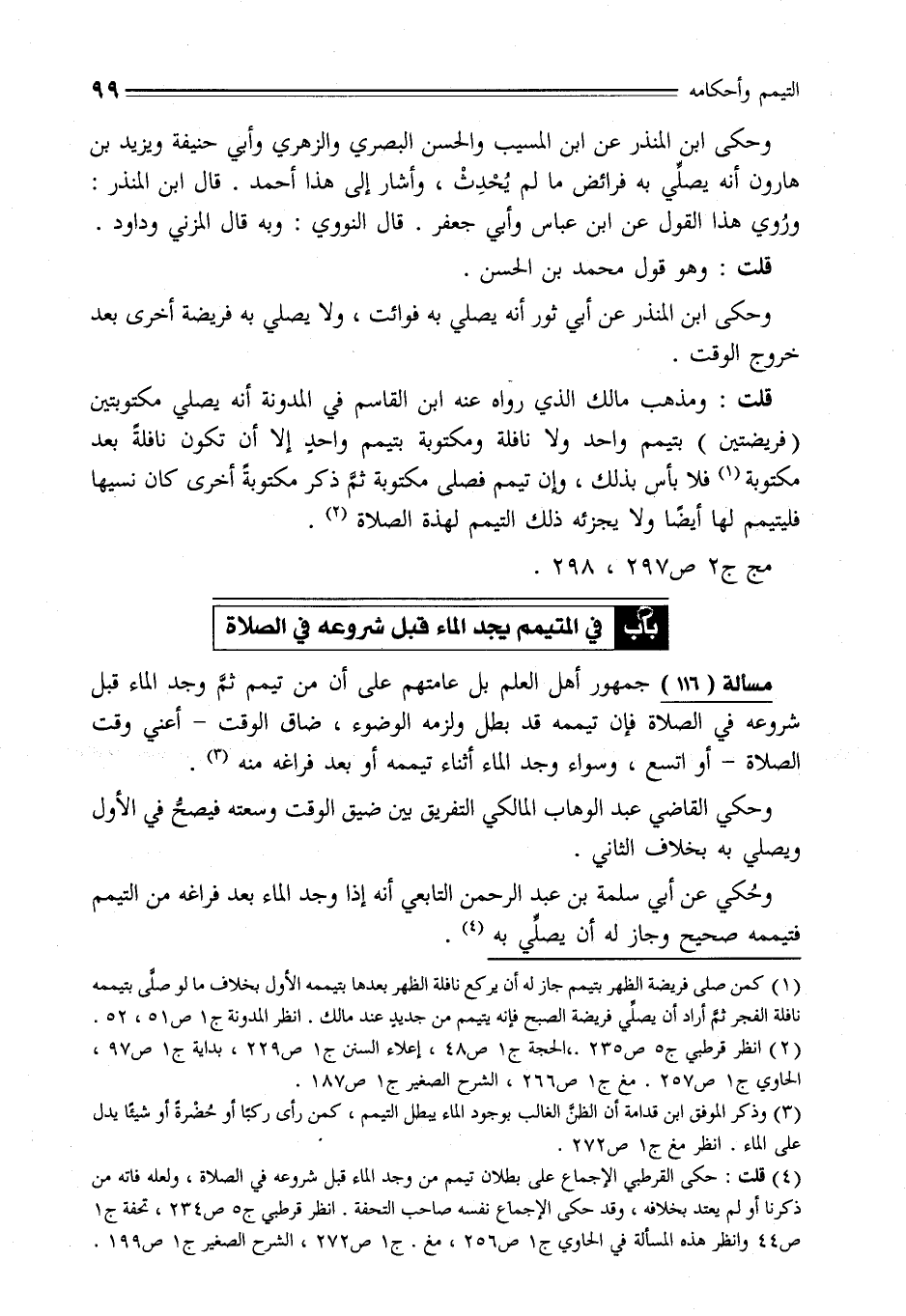 (¬4) قلت: حكى القرطبي الإجماع على بطلان تيمم من وجد الماء قبل شروعه في الصلاة، ولعله فاته من ذكرنا أو لم يعتد بخلافه، وقد حكى الإجماع نفسه صاحب التحفة. انظر قرطبي ج 5 ص 234، تحفة ج 1 ص 44 وانظر هذه المسألة في الحاوي ج 1 ص 256، مغ. ج 1 ص 272، الشرح الصغير ج 1 ص 199.
