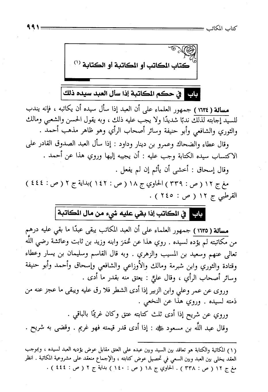 (¬1) المكاتبة والكتابة هو تعاقد بين السيد وبين عبده على العتق مقابل عوض يؤديه العبد لسيده، وبموجب العقد يخلى بين العبد وبين السعي في تحصيل عوض كتابته، والإجماع منعقد على مشروعية المكاتبة. انظر مغ ج 12 (ص: 338). الحاوي ج 18 (ص: 140) بداية ج 2 (ص: 444).