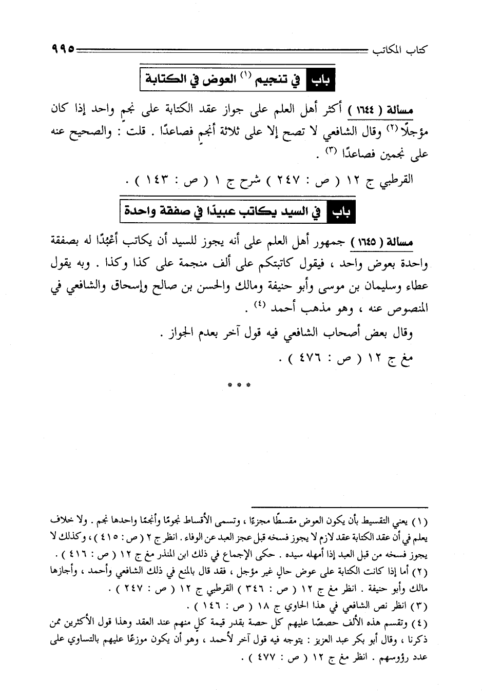 (¬1) يعني التقسيط بأن يكون العوض مقسطًا مجزءًا، وتسمى الأقساط نجومًا وأنجمًا واحدها نجم. ولا خلاف يعلم في أن عقد الكتابة عقد لازم لا يجوز فسخه قبل عجز العبد عن الوفاء. انظر ج 2 (ص: 415)، وكذلك لا يجوز فسخه من قبل العبد إذا أمهله سيده. حكى الإجماع في ذلك ابن المنذر مغ ج 12 (ص: 416).
