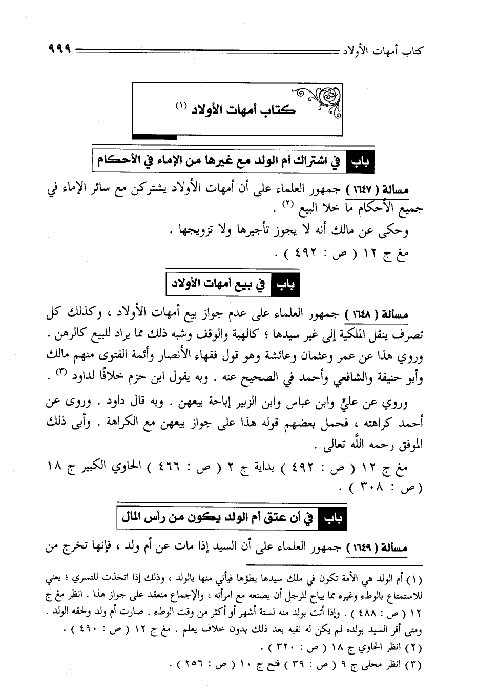 مسألة (1647) جمهور العلماء على أن أمهات الأولاد يشتركن مع سائر الإماء في جميع الأحكام ما خلا البيع (¬2).