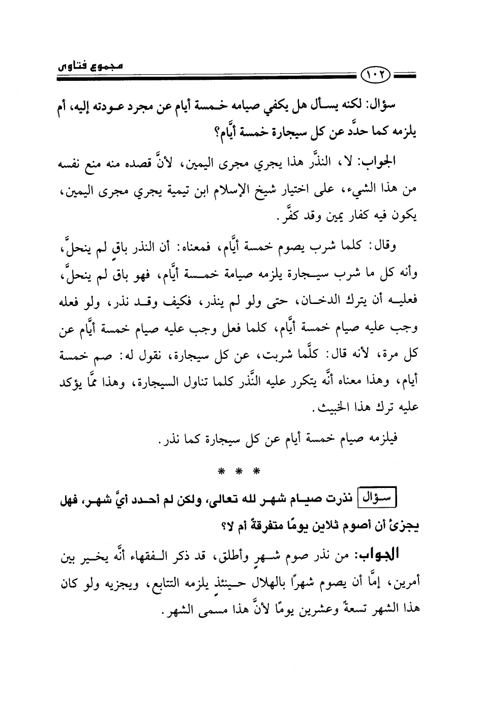 سؤال: لكنه يسأل هل يكفي صيامه خمسة أيام عن مجرد عودته إليه، أم يلزمه كما حدد عن كل سيجارة خمسة أيام؟