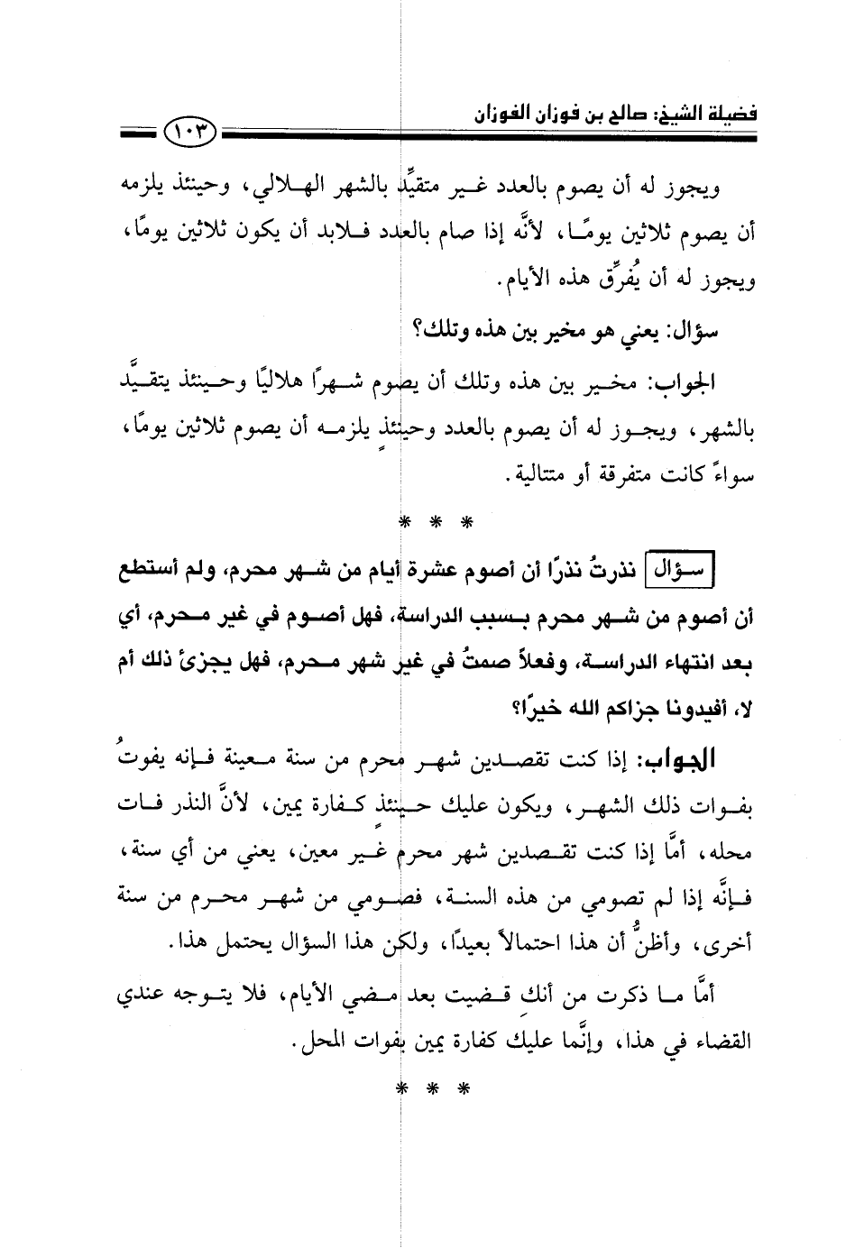 سؤال: نذرت نذرًا أن أصوم عشرة أيام من شهر محرم، ولم أستطع أن أصوم من شهر محرم بسبب الدراسة، فهل أصوم في غير محرم، أي بعد انتهاء الدراسة، وفعلًا صمت في غير شهر محرم، فهل يجزئ ذلك أم لا، أفيدونا جزاكم الله خيرًا؟